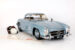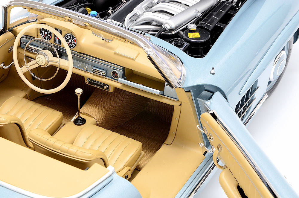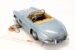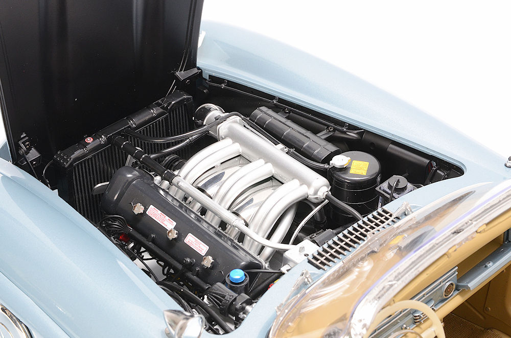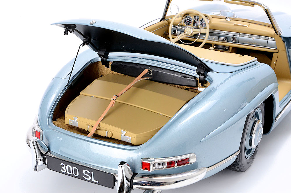 The model features premium construction with a full metal tubular frame, a pre‑painted metal body, and meticulously sorted components. Its screw‑assembled design eliminates the need for glue, ensuring a clean and frustration‑free building experience. Functionality is extensive, including a complete lighting system with parking, low and high beams, indicators, dashboard and footwell illumination, brake and reverse lights. The model also incorporates opening doors, hood, trunk, glove box, and fuel filler cap, along with foldable seats, a convertible top compartment, steerable wheels, and a detailed spare. Both a Softtop and Hardtop are included, and the period‑correct luggage set doubles cleverly as the battery compartment.