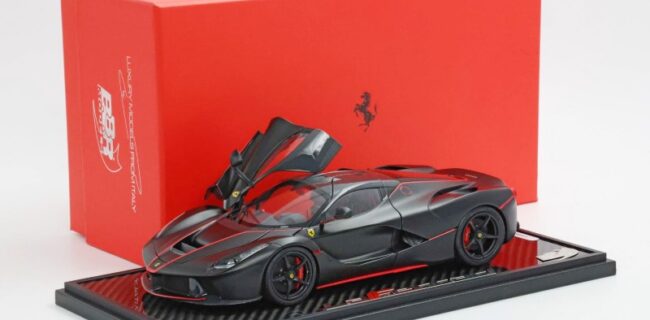 BBR is set to release the 1:18 metal and opening Ferrari LaFerrari in Matt Black with Red stripes. Two versions will be made available, hard carbon base and leather base. Each limited to 200/100 units respectively.