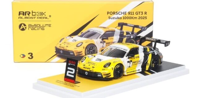 AR Box, sub-brand of Almost Real are presenting this lovely diecast metal 1:64 Porsche 992 GT3 R – Yellow Suzuka 1000km 2025 #7 livery replica. No word on production numbers, but the model will arrive in mid to late February 2026.