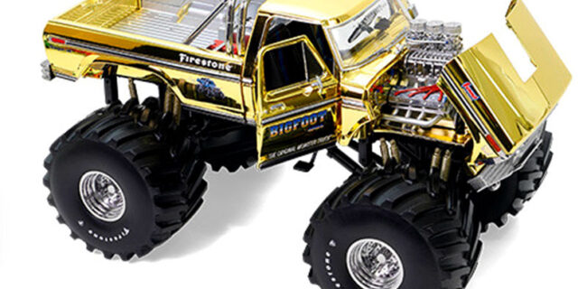 GreenLight Collectibles is bringing back the Bigfoot mould.  The team is issuing a Bigfoot #1 50th Anniversary – 1974 Ford F-250 Monster Truck in Gold Chrome exterior with Bob Chandler figure.  Other than the Gold paint and figurine, the price has definitely gone north.  The suggested retail price is $199 US.  Originally had for $106 US or $149 CND.