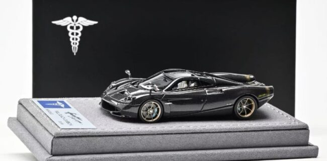 News from Hermes Collection is the new 1:64 scale metal and sealed Huayra Codalunga. Three colour options include: Iridescent Bronzo Aymara Wood Trim Specification, Full Black Carbon and Matt Grigio Montecarlo. Product is capped at 149 units or less. Delivery is noted as March 2026.