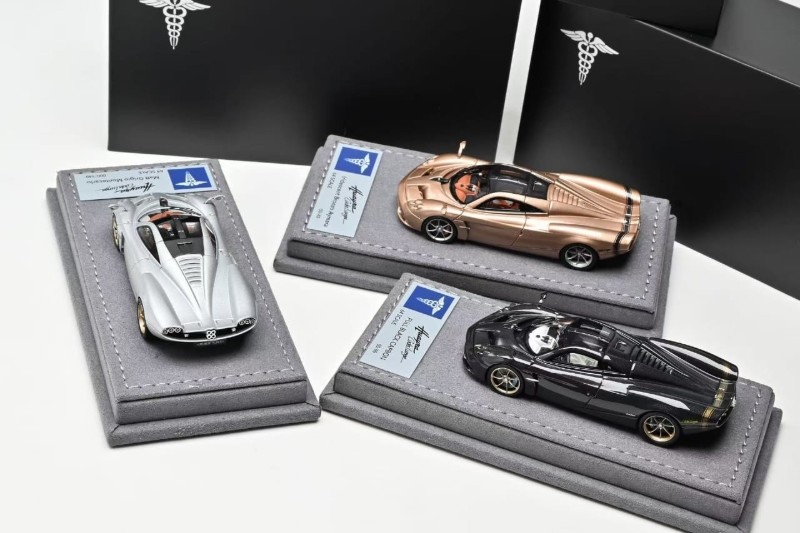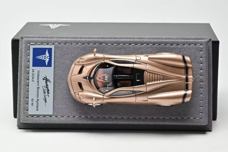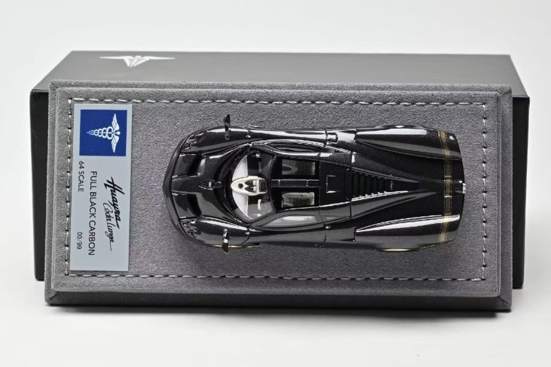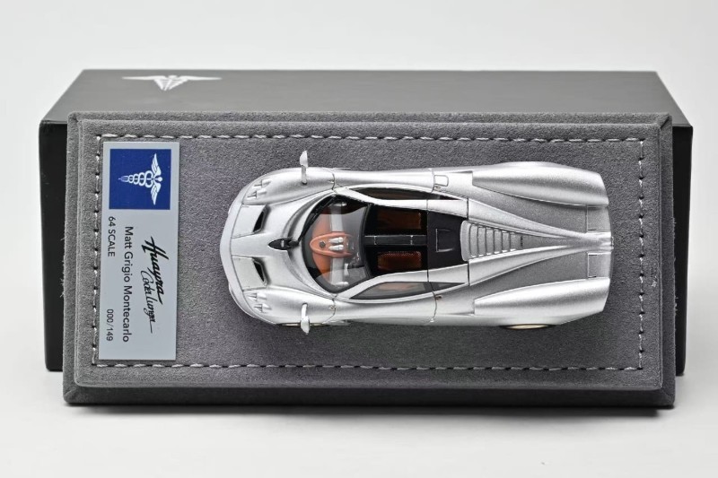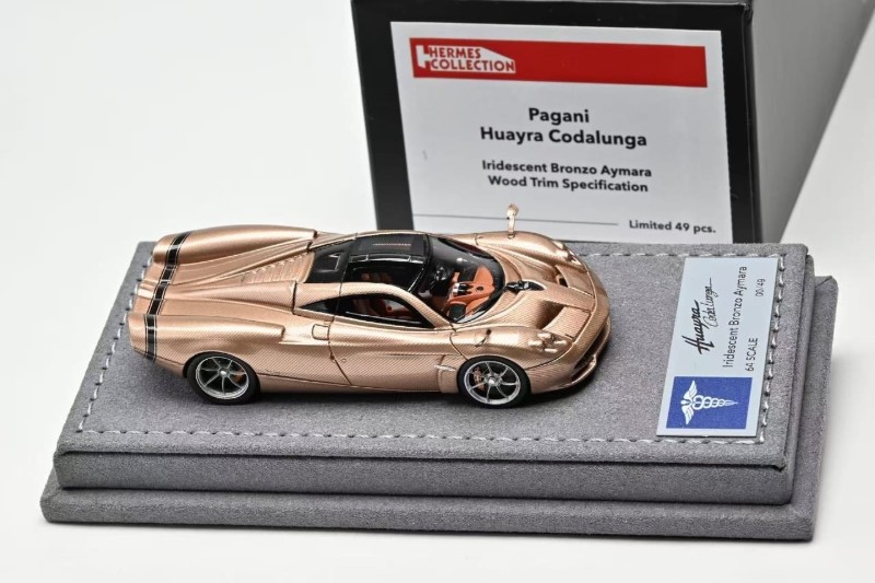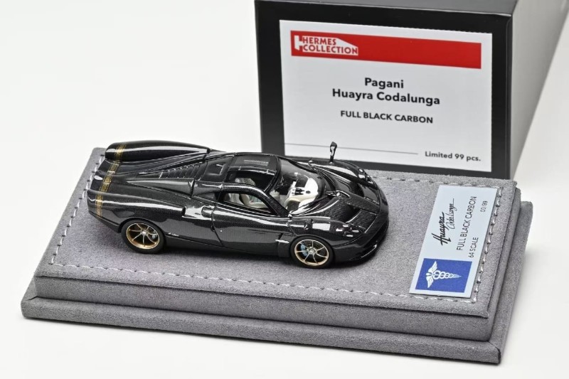 News from Hermes Collection is the new 1:64 scale metal and sealed Huayra Codalunga. Three colour options include: Iridescent Bronzo Aymara Wood Trim Specification, Full Black Carbon and Matt Grigio Montecarlo. Product is capped at 149 units or less. Delivery is noted as March 2026.