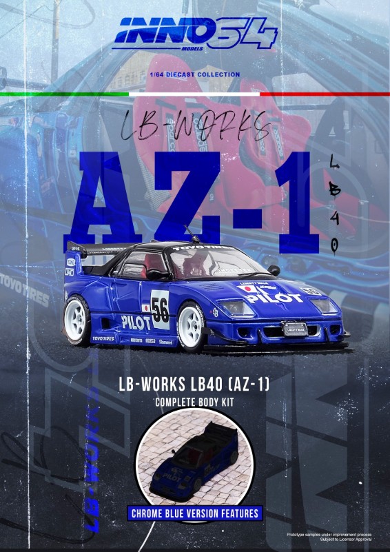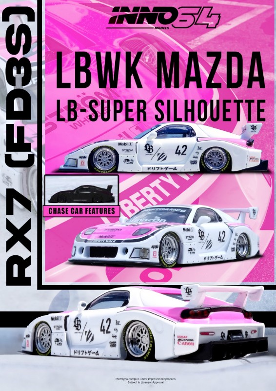 INNO64 is back with a couple of Liberty Walk influenced models. Cars include the LB40 (AZ-1) with complete body kit and the Mazda RX-7 LB Super Silhouette. These will hit shelves soon!