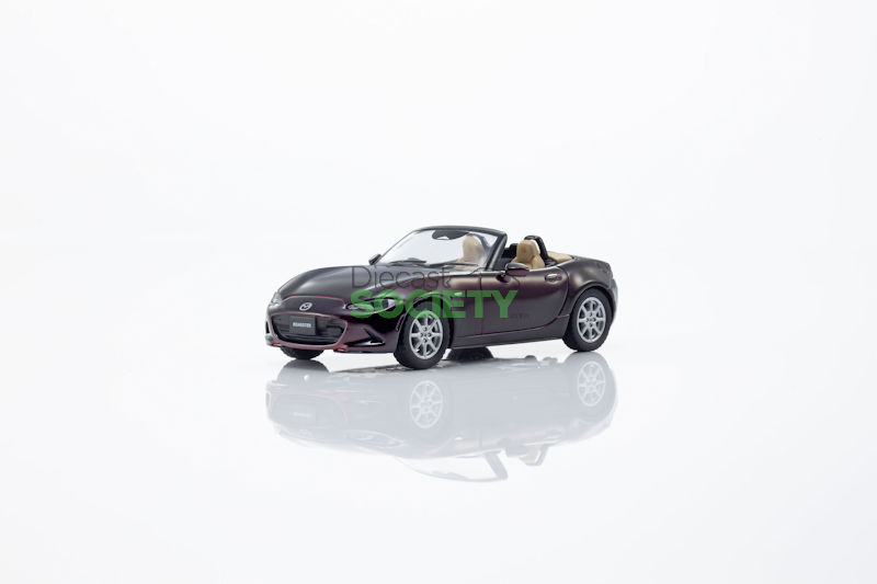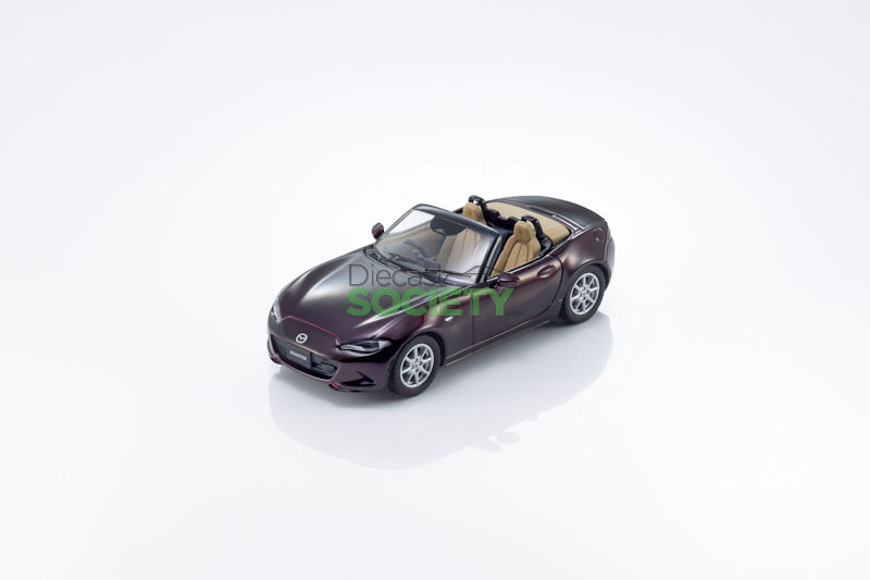 Kyosho expands its 1:64 diecast selection with this classic Mazda Roadster 35th Anniversary in Red exterior and Brown/Black interior. Delivery is noted as April 2026. Suggested retail $21.48 US.