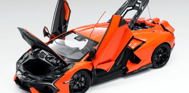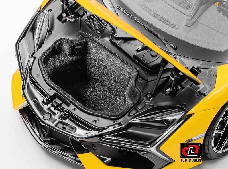 Official images of the production 1:18 diecast metal and opening Lamborghini Revuelto have been released by LCD Models. Wow, the results are outstanding. You can clearly see they can compete with other premier brands. The attention to detail on the motor far exceeds the results from AUTOart in the surrounding area. If there was one complaint, we believe LCD was too conservative in the exterior colours. Initial offerings include: Orange, Yellow and White. Retail is around the $320 CND. This example will hit shelves sometime in Q1 2026.
