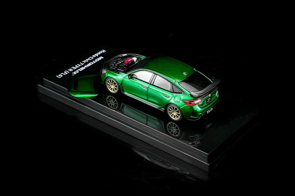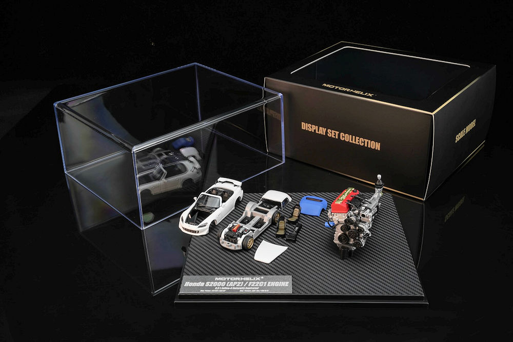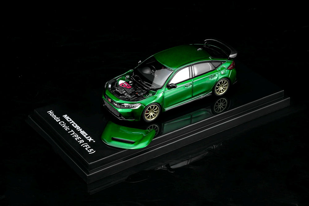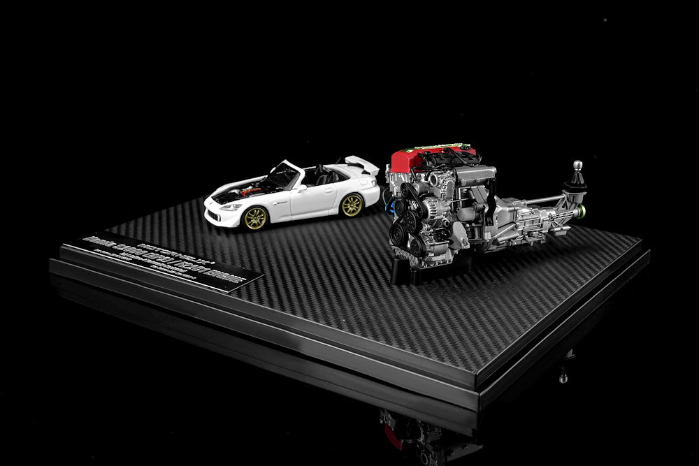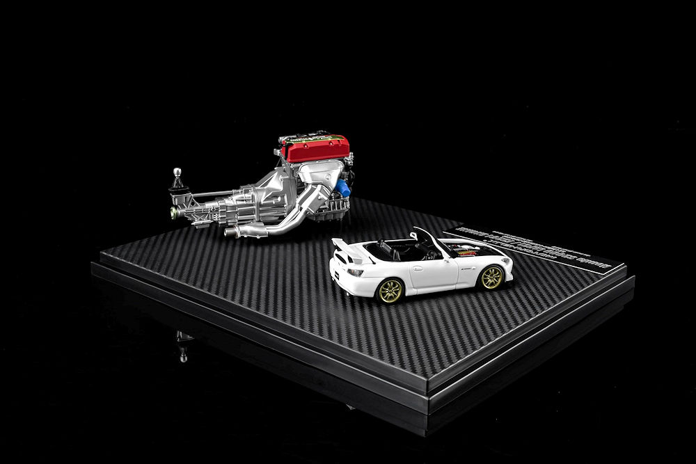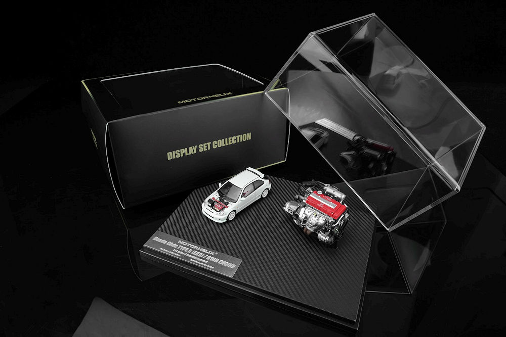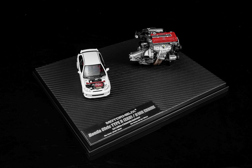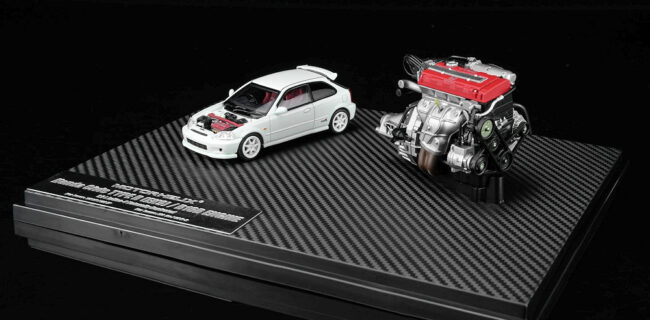Fans of 1:64 scale may want to add these upcoming pieces to their purchase list. MotorHelix is back with several cool pieces. The first batch includes a 1:64 scale car and a 1:18 scale motor. Honda S2000 (AP2) Pearl White with F22C1 engine and the Honda Civic TYPE R (EK9) White with B16B engine. Also in the mix is the 1:64 Honda Civic TYPE R (FL5) in Metallic Green and the Mitsubishi Lancer Evolution IV GSR – Monte Carlo Livery with rally diorama base. Fantastic presentation. Production is limited to 599 pieces or fewer and is an HEC exclusive!