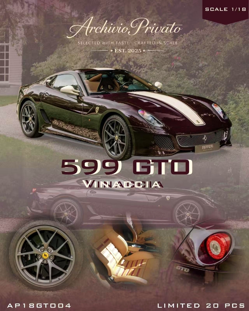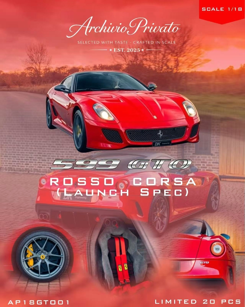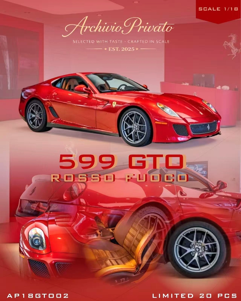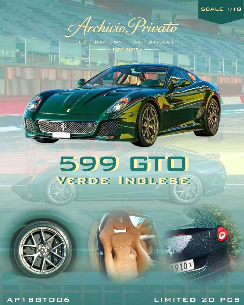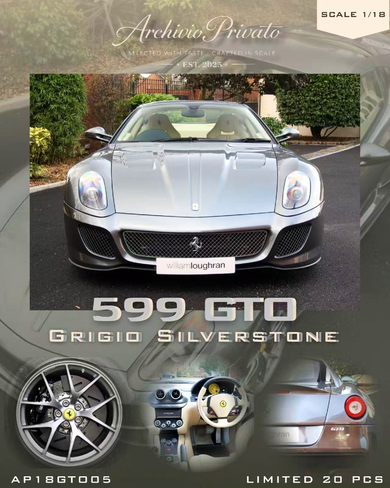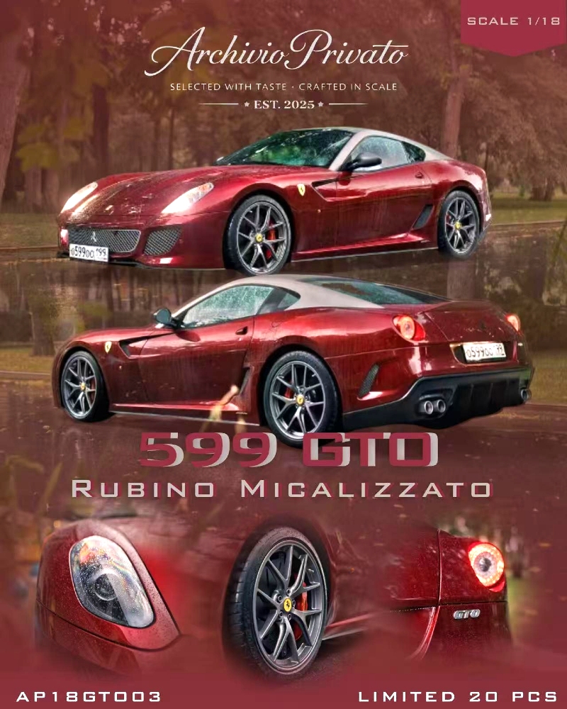 This one came across the desk, a new brand called Archivio Privato. Seems the team was established in 2025. and their first production piece is set for resin and sealed. The car, the Ferrari 599 GTO. Colour options, all limited to 20 units include: Rosso Corsa, Rosso Fuoco, Rubino Micalizzato, Vinaccia, Grigio Silverstone and Verde Inglese. Delivery is noted as Q3 2026. Each piece will shipped with carbon fibre-like base.