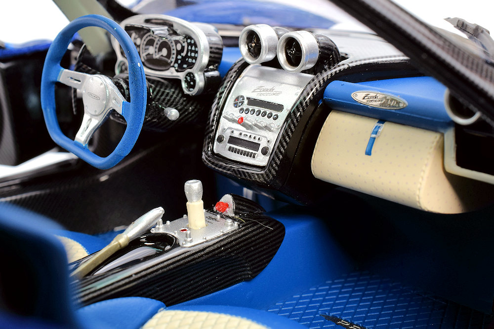 The interior is equally well-appointed, though it invites a surprising comparison: dare I say, the LCD Lamborghini Revuelto may actually surpass this Pagani, specifically in the realism and variety of its interior textures.