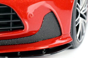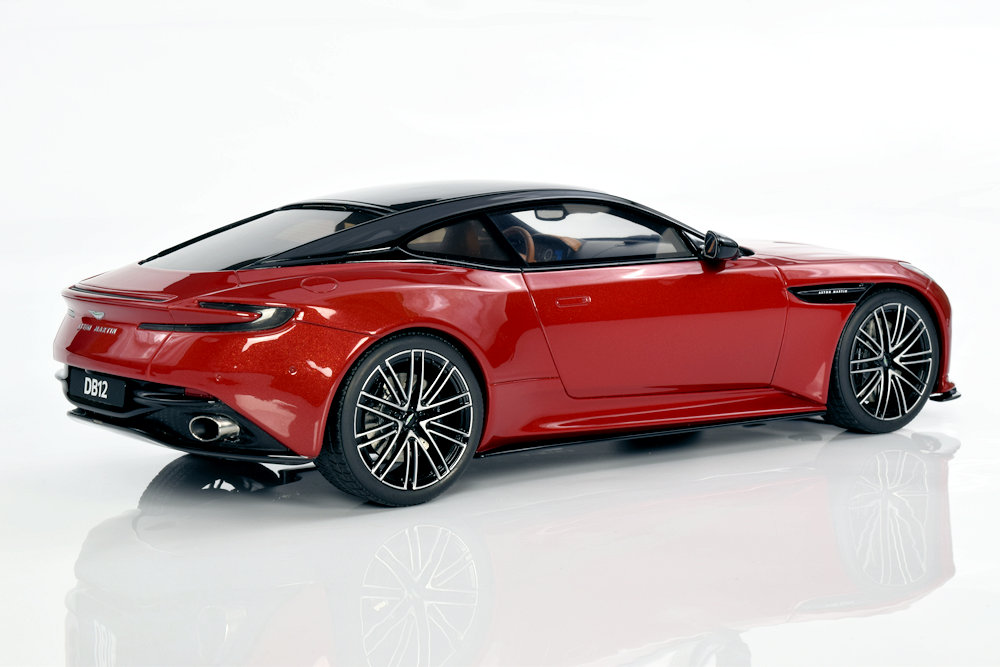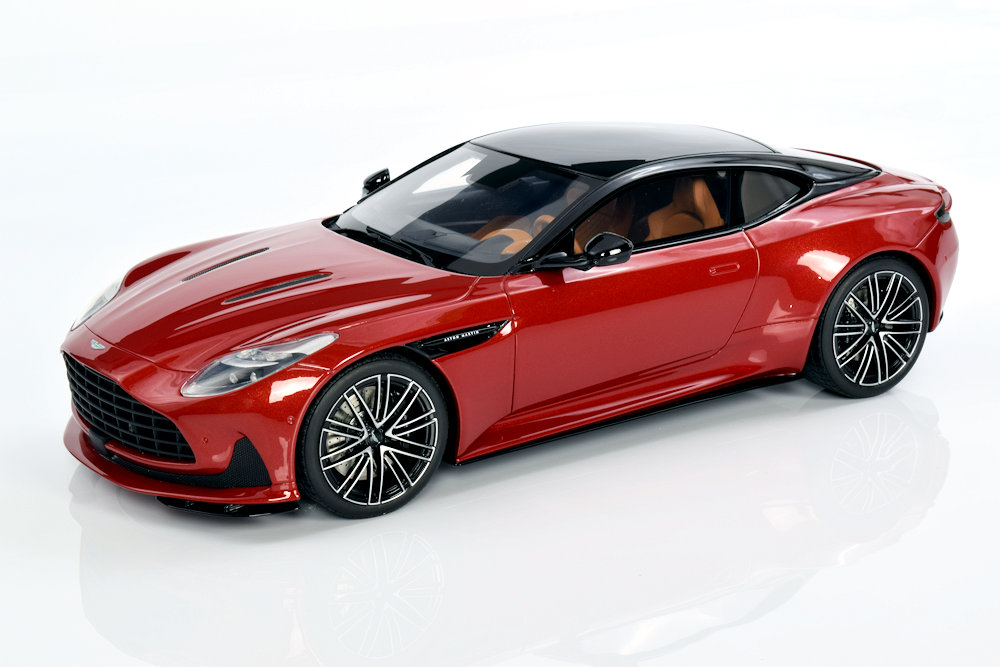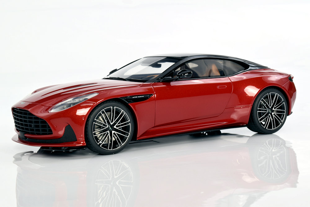 GT Spirit’s Aston Martin DB12 Coupe continues the brand’s consistent approach to resin, sealed-body replicas that emphasize value and visual impact over functional features. The Hyper Red finish paired with a contrasting Black roofline gives this coupe a bold, modern presence, while the wheel set—shared with the Volante—remains a highlight for its crisp detailing and accurate proportions. Compared to the Caribbean Blue Volante, which carries a lighter, more elegant tone, the coupe’s specification leans toward a sportier, more assertive character, making it a strong complement in a collection.