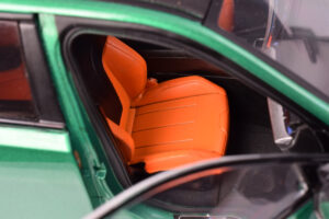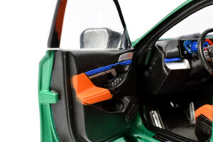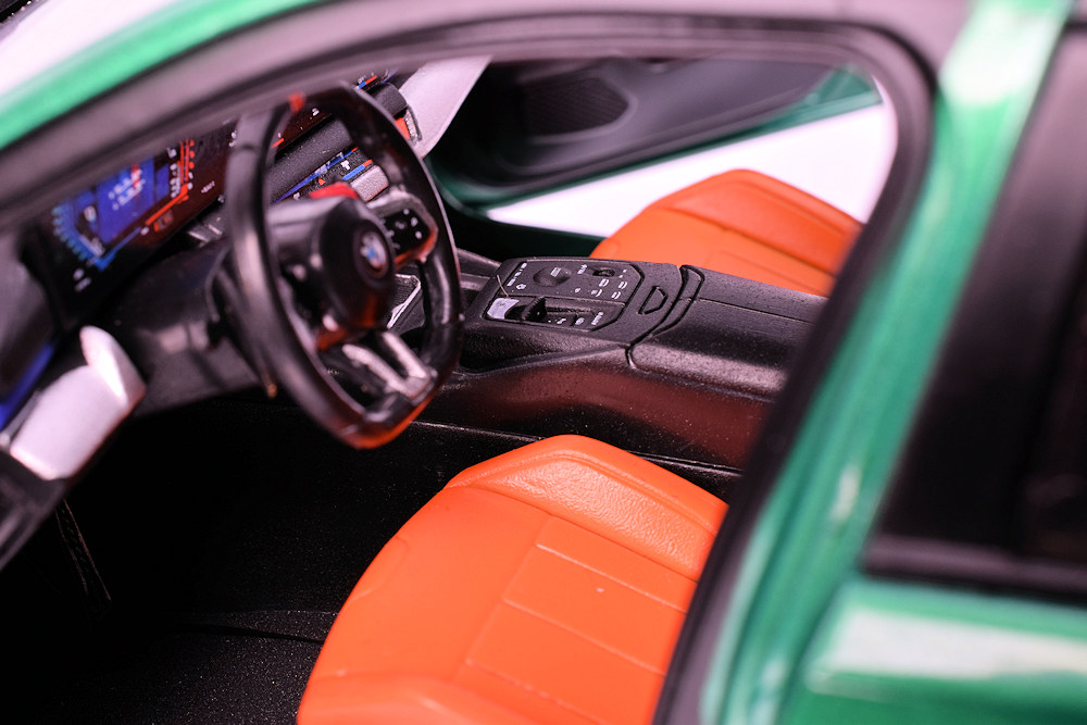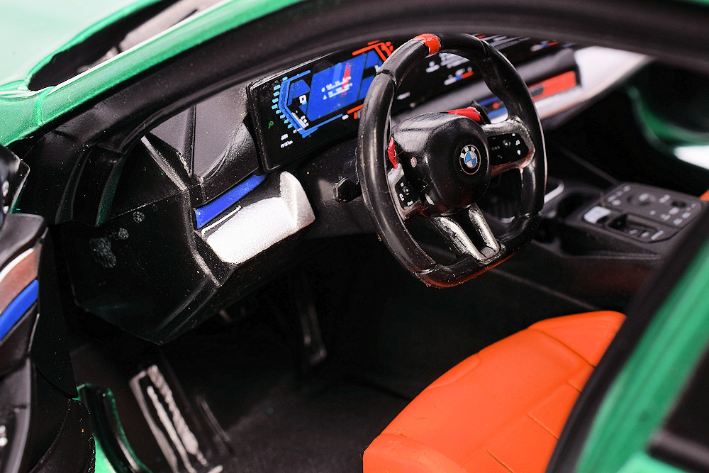 The interior reflects the model’s accessible price point, with limited fine detailing but a cohesive overall presentation. The tan and black colour scheme, combined with the familiar blue M striping across the dashboard, creates a clean and purposeful look. While close inspection reveals simplified detailing, the interior works effectively as part of the complete model and complements the exterior without drawing attention to its limitations.