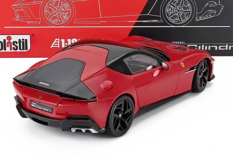 More news from Polistil: the new 1:18 scale Ferrari 12Cilindri, constructed in metal with opening features, is now reaching retailers. This particular version is finished in classic Rosso Corsa with black wheels. An additional highlight is the included display base with a protective cover, adding value for collectors. Based on the images currently available, the model appears very similar in execution to a standard Bburago Signature release. However, the suggested retail price is approximately 119 euro, which places it notably above the typical Bburago Signature price point of around 80 euro, with F1 examples with similar base/cover coming in around 100 euro.