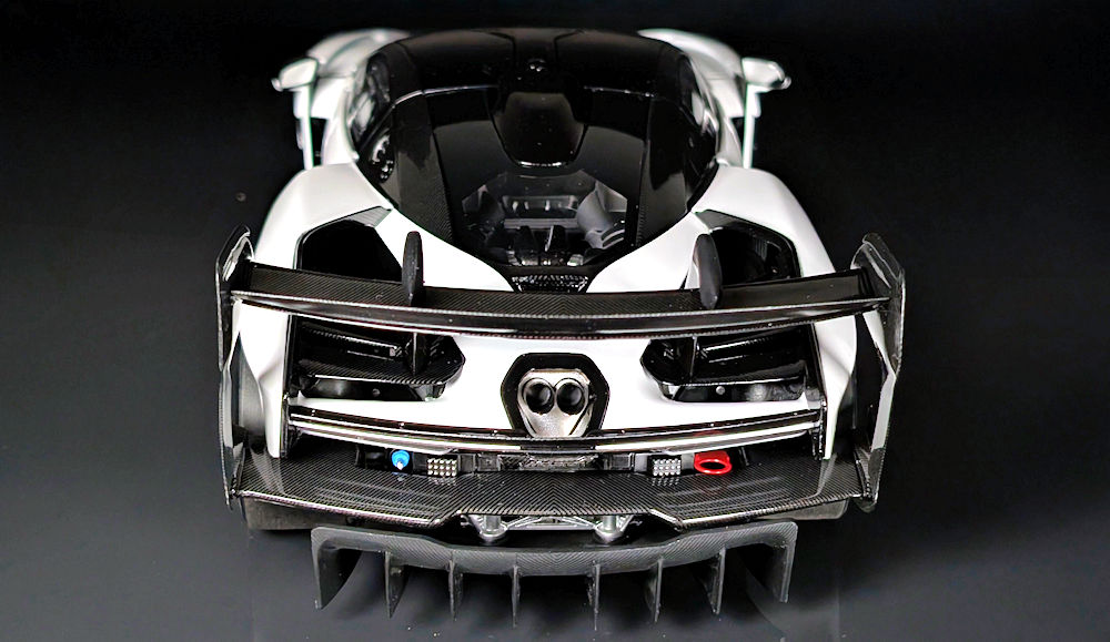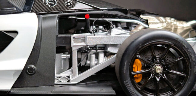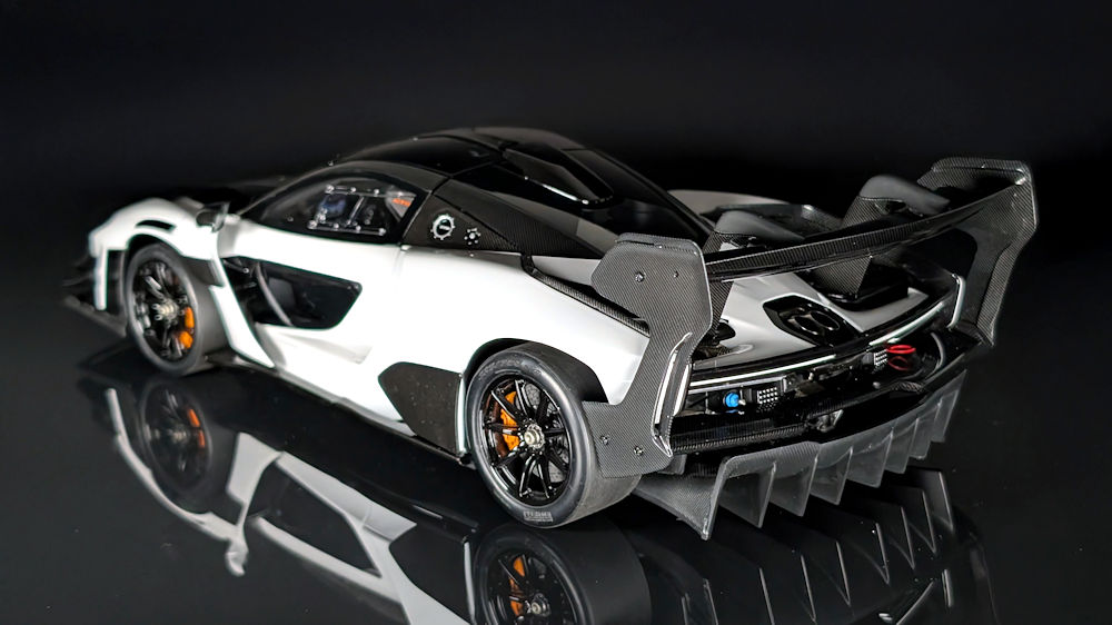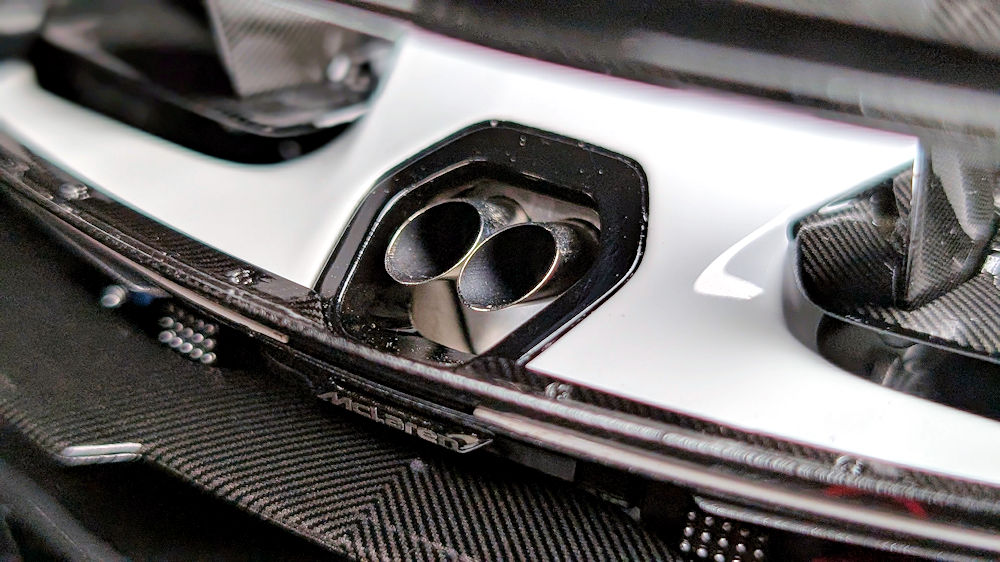 As with the real car, due to the absence of a rear mesh, some of the intricacies of the air-jack system and transmission casing are visible when viewed head-on from the rear. Other details, such as the photo-etched McLaren badge at the centre, the dual LED rain lights, and the red recovery hook, have also been faithfully replicated, rounding off a well-executed rear end.
