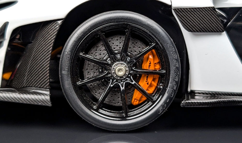The black centre-lock wheels are excellently detailed, and feature Pirelli branding, tyre size markings, and even proper valve stems. The tyres come with a lightly scrubbed finish, which contributes to the overall realism. Behind the rims, the orange McLaren-branded brake calipers and carbon ceramic brake discs are both skillfully reproduced.
