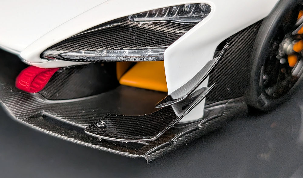 In the front, some of the most notable differences compared to the road car include a larger front splitter and side canards. The splitter is made from carbon fibre textured plastic. The canards are, however, finished in carbon decals, which are glossy in finish, giving them a more realistic appearance.