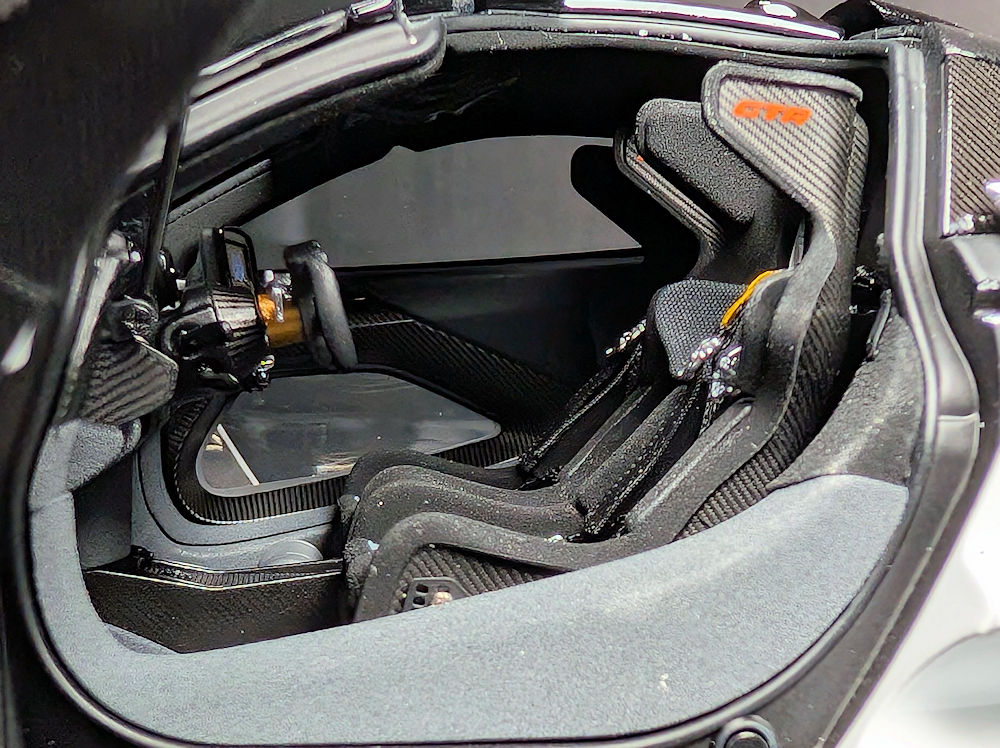 The signature see-through glass panels in the doors are present, while the road car’s F1-inspired split side windows have been replaced with more traditional ones. There is a small sliding window on the driver’s side, in true track-car fashion, but it is non-functional on the model. The plastics used for the windows and windshield are fairly clear.