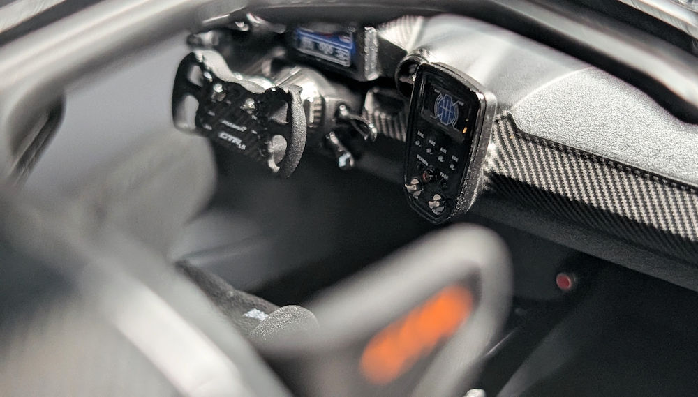 The execution of the Sabelt racing seats is particularly outstanding. As mentioned before, they are completed in an Alcantara-like material with neatly laid out seat padding. As for the seat backs, they are clad in carbon fibre decals. The metal hardware mounted low on the sides of the seats looks impressive as well. The Sabelt five-point harnesses are faithfully recreated using fabric straps and photo-etched buckles.