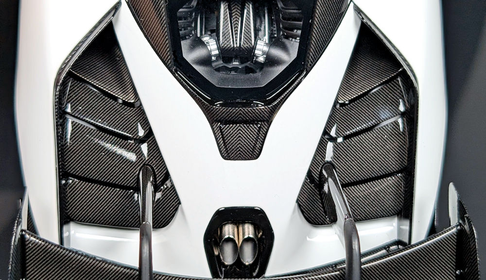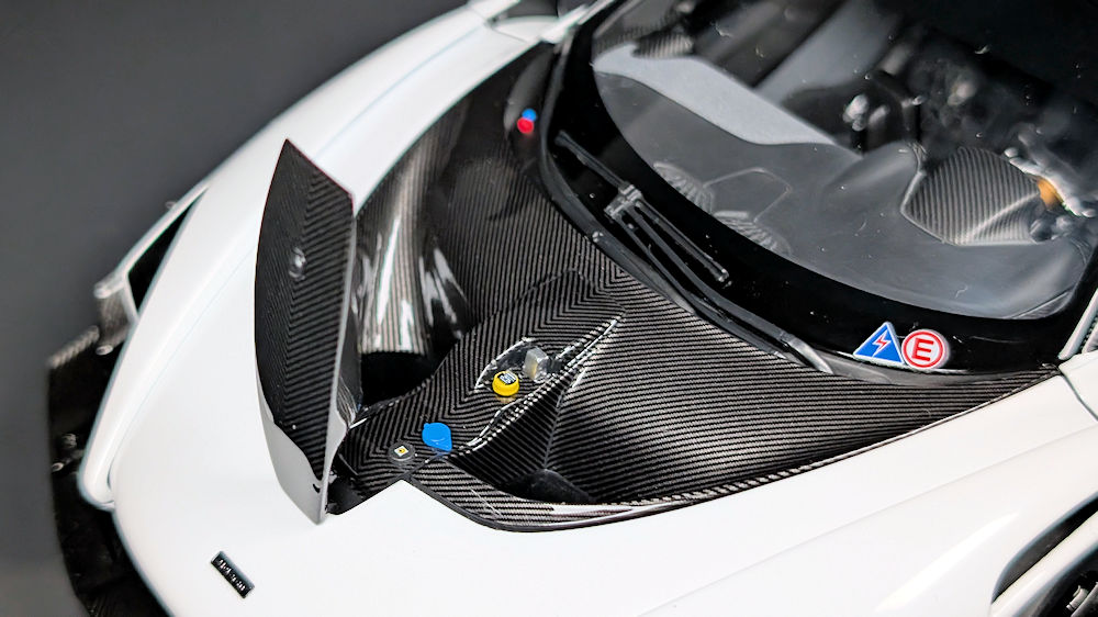 The large hood vent and the panel running across the middle are both finished in glossy carbon decals with perfectly aligned weaves. Just like on the real car, this panel can be lifted to access the windshield washer, steering, and transmission fluids. In comparison, AUTOart’s Senna road car lacks this feature, and going by the pictures they released of the sample, their Senna GTR doesn’t seem to have it either.