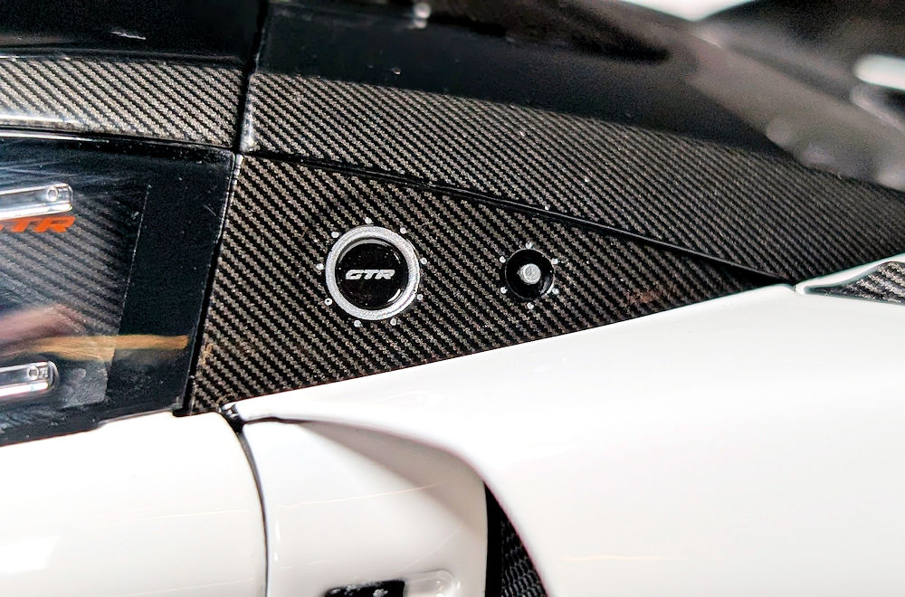 Located just behind the driver’s side window are the neatly replicated fuel receptacle and pump-out nozzle, both of which are unique to the GTR compared to the road car.
