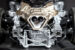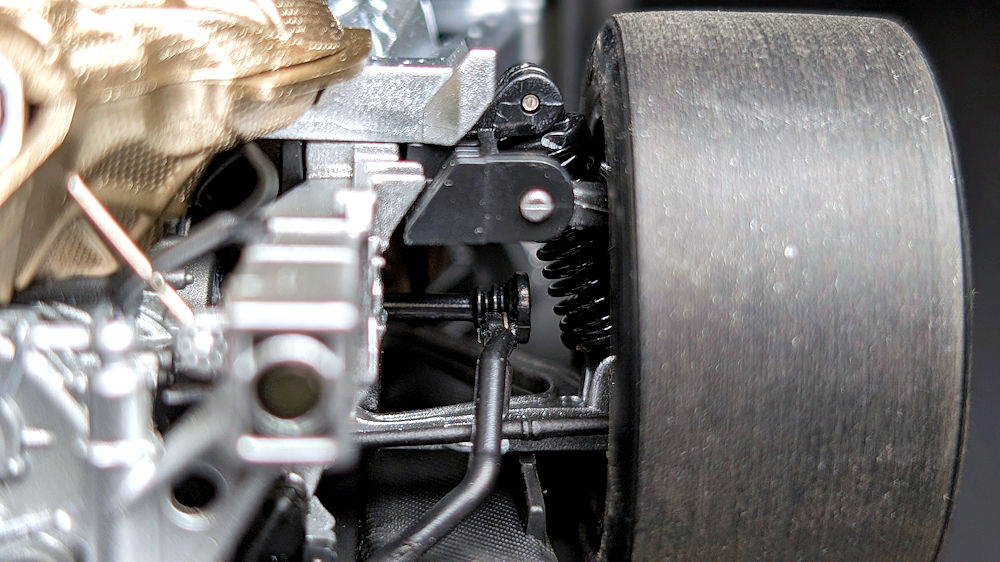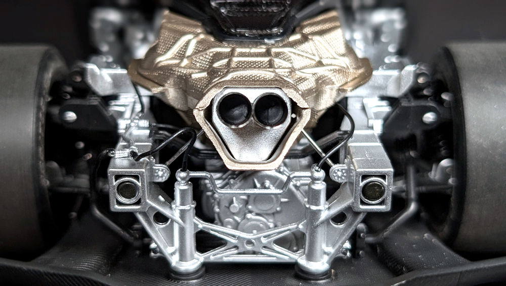 With the rear clamshell taken off, the heat shield is the first thing that caught my eye. Although it partially obstructs the view from above, there is still an impressive amount of detail to absorb. The heat shield, exhaust pipes, subframe, reservoirs, manifolds, automated air-jack system, hoses and cables are meticulously assembled and display an excellent level of craftsmanship. The paint finish and textures of the various components further elevate the realism of the engine bay.