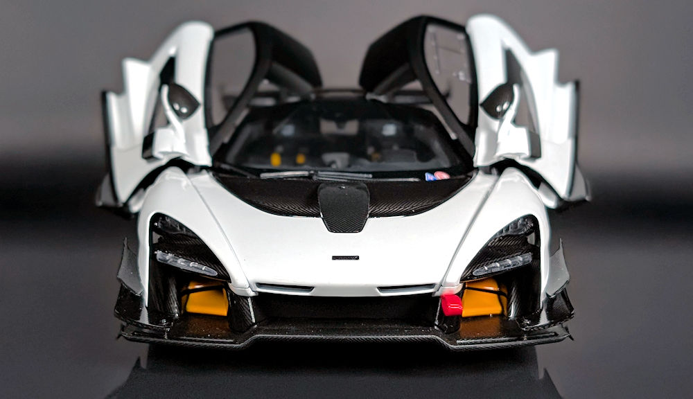 The McLaren badge on the hood looks sharp. The details of the main headlight assembly are somewhat subdued by the black housing, but are represented well. The execution of the DRLs is also acceptable for a model at this price point. The red tow rope and papaya orange active aerodynamic flaps on either side of the front radiator add a splash of colour to an otherwise black & white exterior. The tow rope is recreated using fabric, which is a neat detail.