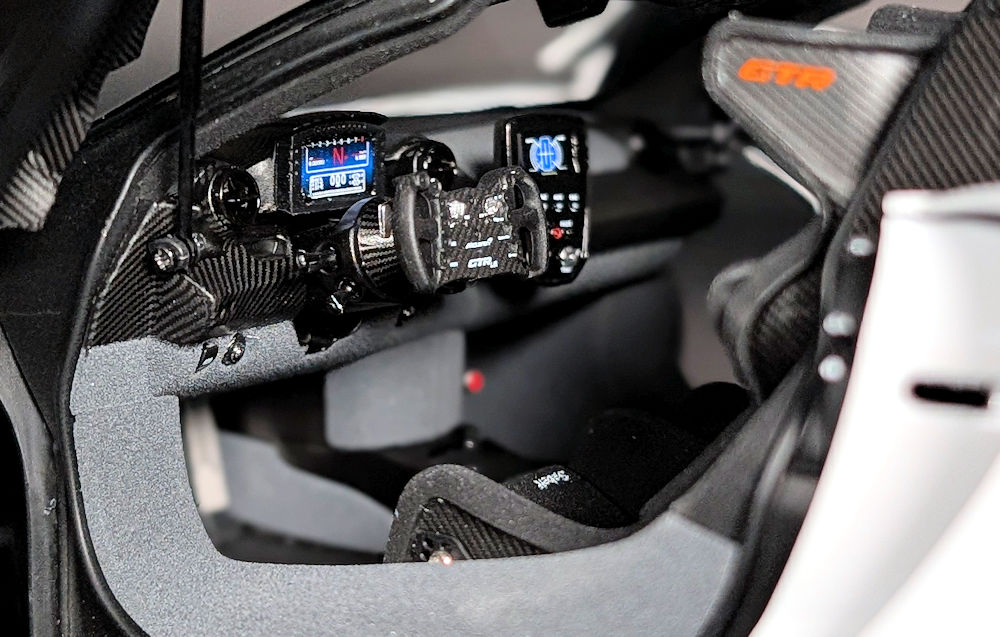 The execution of the Sabelt racing seats is particularly outstanding. As mentioned before, they are completed in an Alcantara-like material with neatly laid out seat padding. As for the seat backs, they are clad in carbon fibre decals. The metal hardware mounted low on the sides of the seats looks impressive as well. The Sabelt five-point harnesses are faithfully recreated using fabric straps and photo-etched buckles.