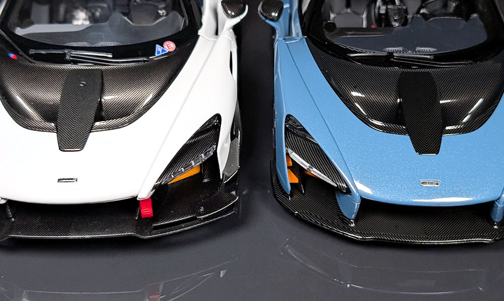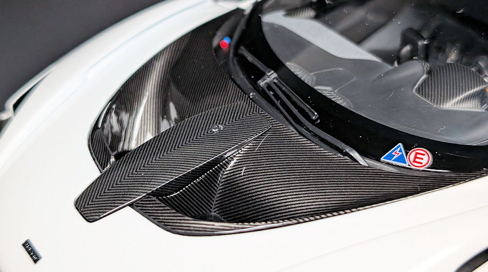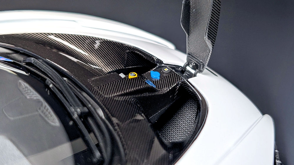 The large hood vent and the panel running across the middle are both finished in glossy carbon decals with perfectly aligned weaves. Just like on the real car, this panel can be lifted to access the windshield washer, steering, and transmission fluids. In comparison, AUTOart’s Senna road car lacks this feature, and going by the pictures they released of the sample, their Senna GTR doesn’t seem to have it either.