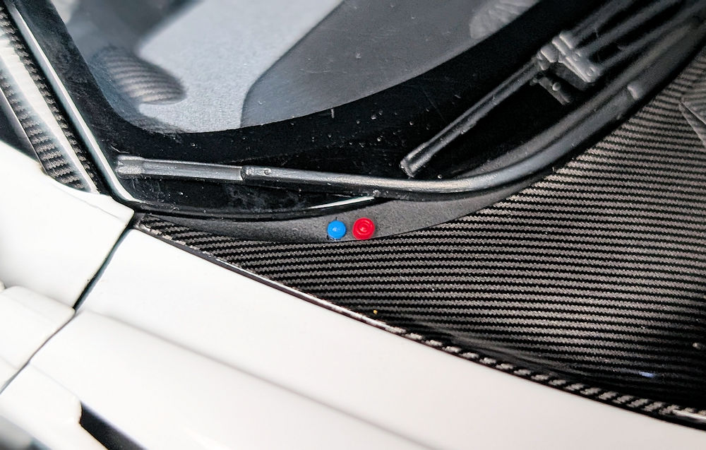 Visible through the large opening in the hood is the radiator, which is faithfully recreated. On the passenger side, just below the windshield wiper, are little red and blue buttons, with the respective identification labels located on the driver’s side. If you are wondering what they’re meant for, the red button operates the fire suppression system, while the blue one is the electrical kill switch to turn off all power to the car. Both are intended for use by the support staff in emergencies.