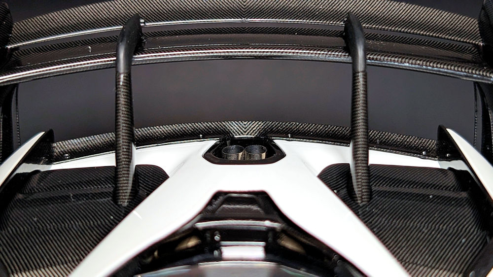 As with the real car, due to the absence of a rear mesh, some of the intricacies of the air-jack system and transmission casing are visible when viewed head-on from the rear. Other details, such as the photo-etched McLaren badge at the centre, the dual LED rain lights, and the red recovery hook, have also been faithfully replicated, rounding off a well-executed rear end.