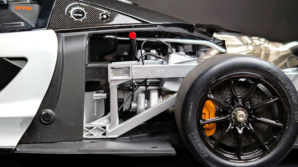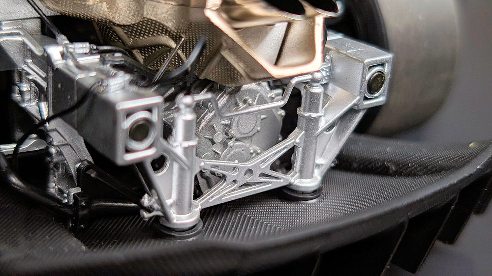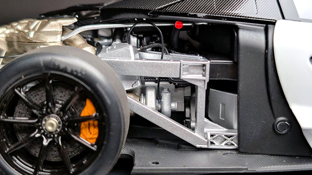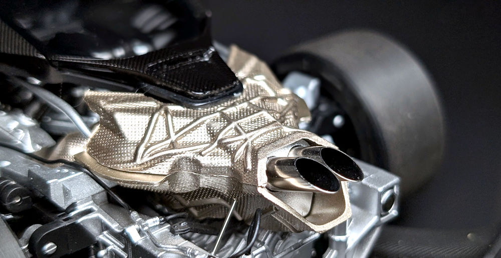With the rear clamshell taken off, the heat shield is the first thing that caught my eye. Although it partially obstructs the view from above, there is still an impressive amount of detail to absorb. The heat shield, exhaust pipes, subframe, reservoirs, manifolds, automated air-jack system, hoses and cables are meticulously assembled and display an excellent level of craftsmanship. The paint finish and textures of the various components further elevate the realism of the engine bay.
