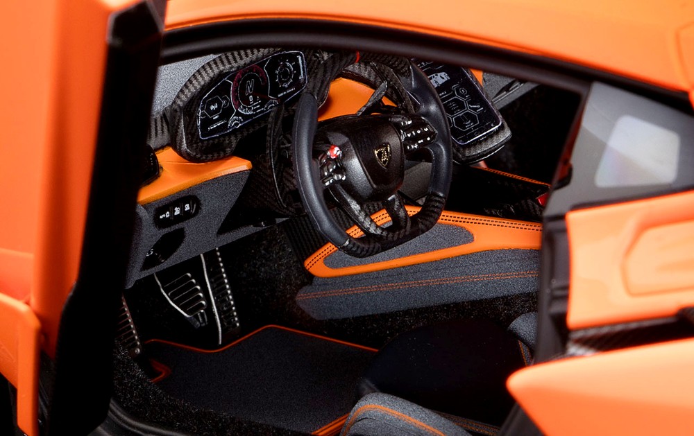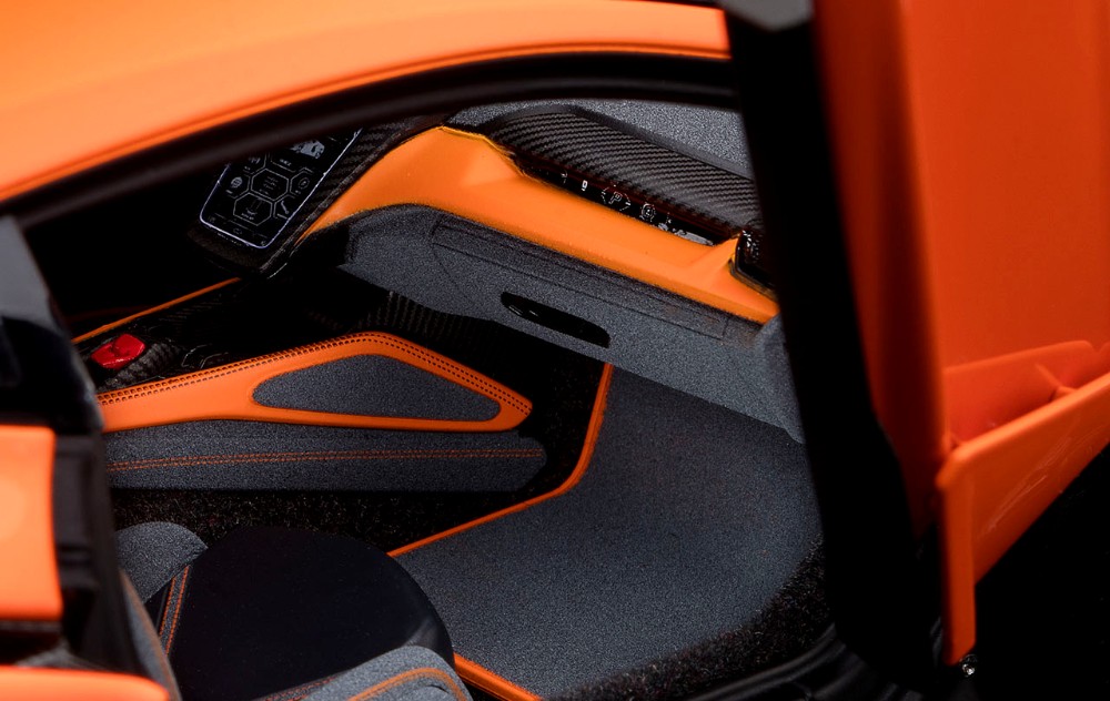Is it perfect? Not entirely. My only real criticism concerns the Alcantara treatment in the interior. While the flocked flooring and floor mats—with their orange piping—look fantastic, the lower dashboard and sides of the comfort seats are finished in a shade of grey that’s too light compared to the real car. These areas should contrast more clearly with the leather sections.