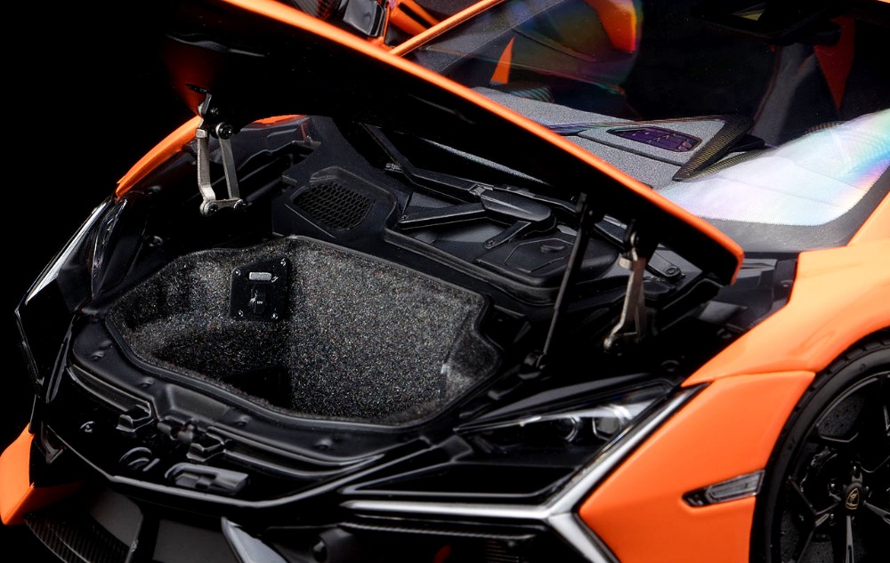 One of the Revuelto’s highlights is its V12 engine, partially visible through the engine cover on the real car. With the LCD Models version, the cover fully opens, allowing a proper view of the engine bay. The detailing here is exceptional: it genuinely resembles a real V12, complete with bright orange high‑voltage cables and even a functional support strut to hold the engine cover open—just like the real thing.