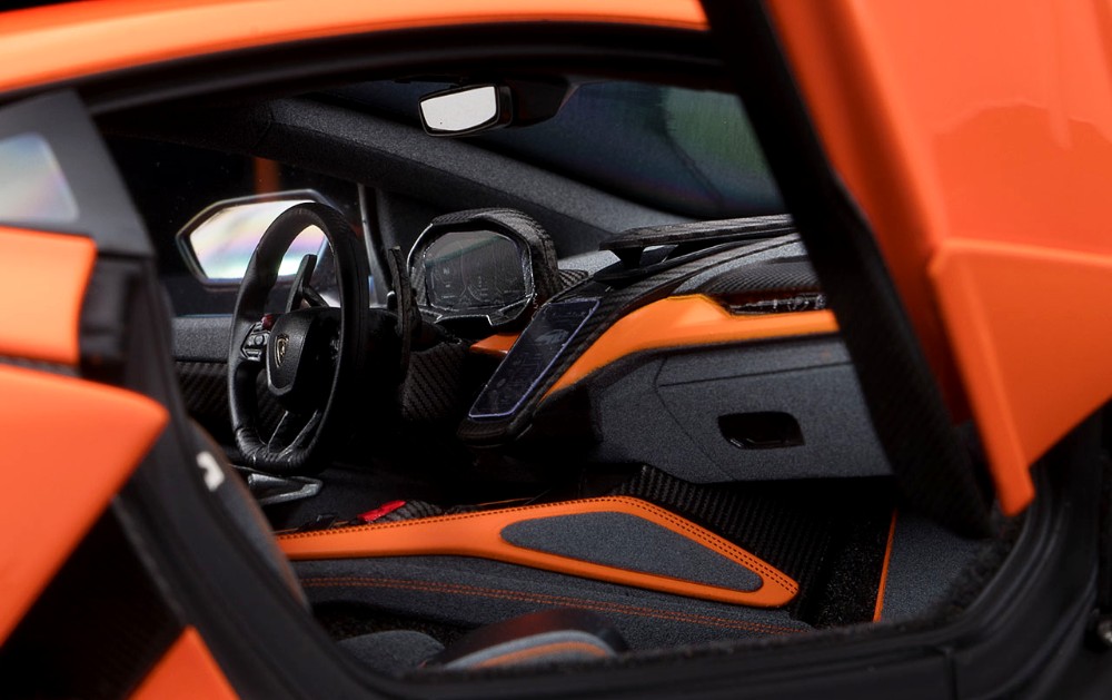 Is it perfect? Not entirely. My only real criticism concerns the Alcantara treatment in the interior. While the flocked flooring and floor mats—with their orange piping—look fantastic, the lower dashboard and sides of the comfort seats are finished in a shade of grey that’s too light compared to the real car. These areas should contrast more clearly with the leather sections.