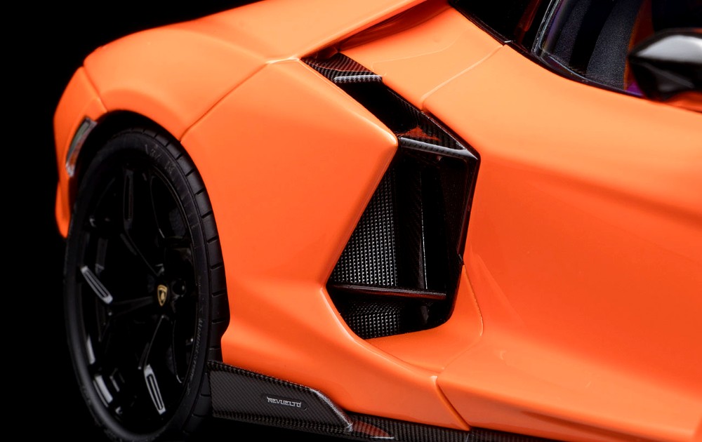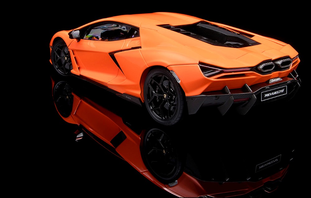 As always, the scale model world followed closely. MR was among the first to announce a 1:18 scale Revuelto, listing it for release in March 2023—just days after the real car’s unveiling. However, it took over a year before MR actually began shipping models. The official press version, LAMBO058A in Arancio Apodis, finally arrived for me in July 2024.