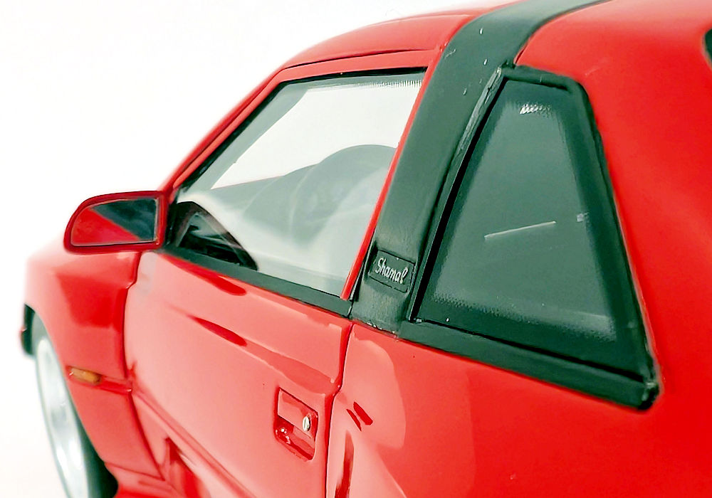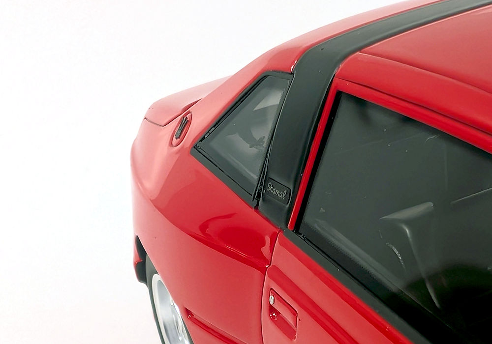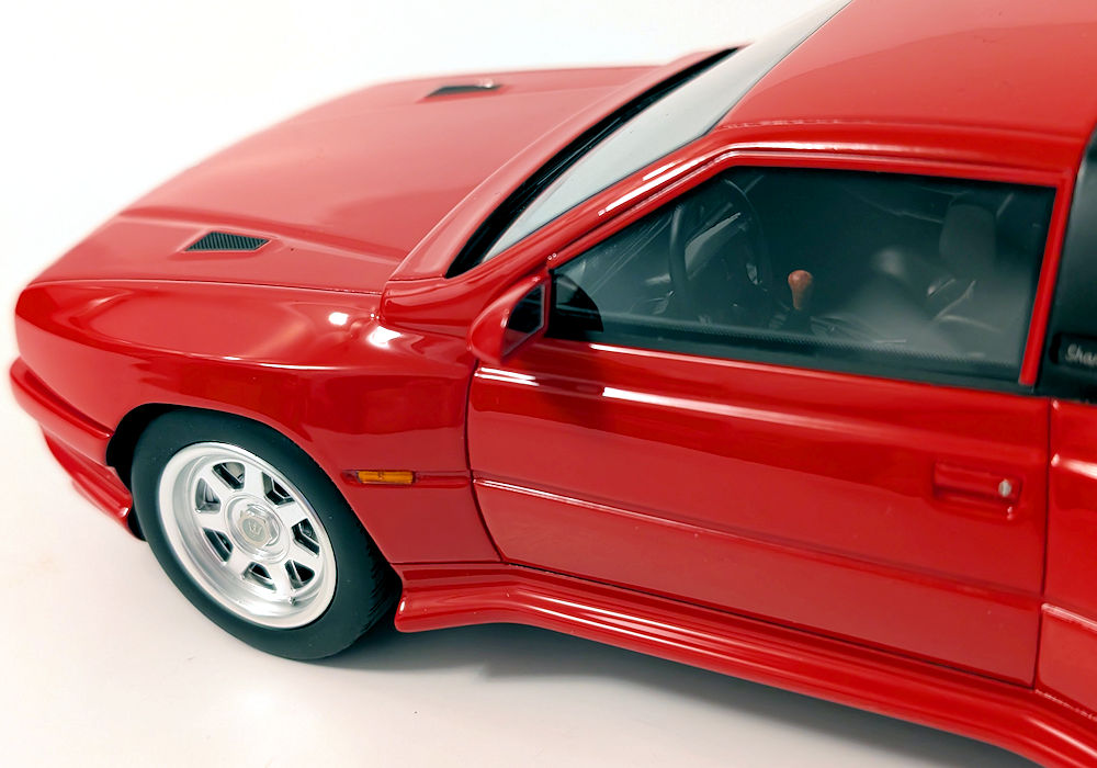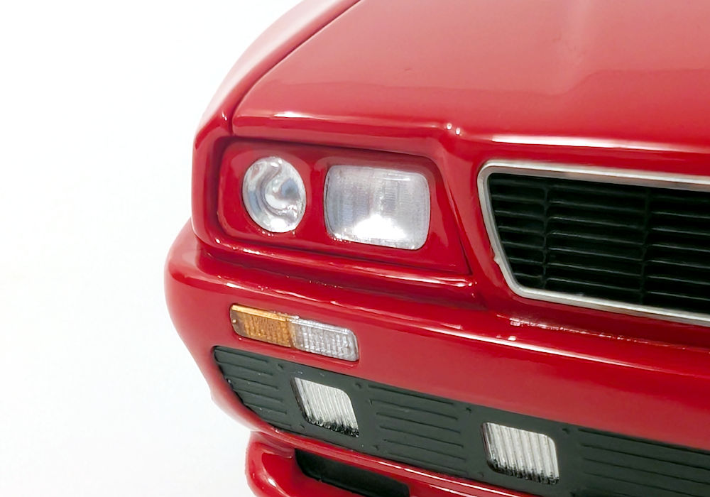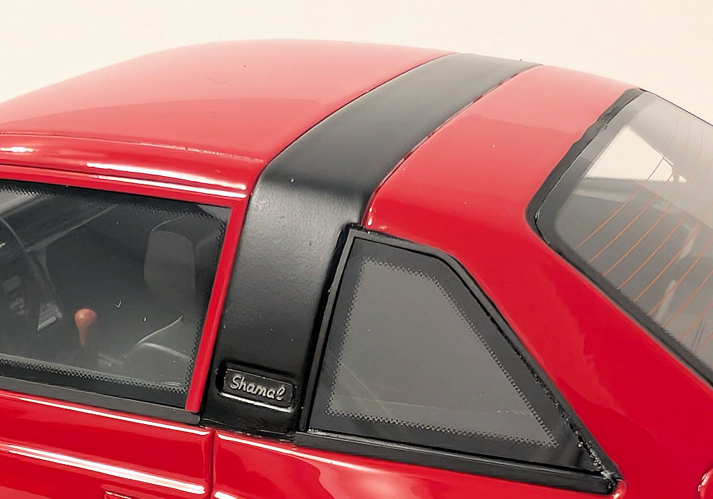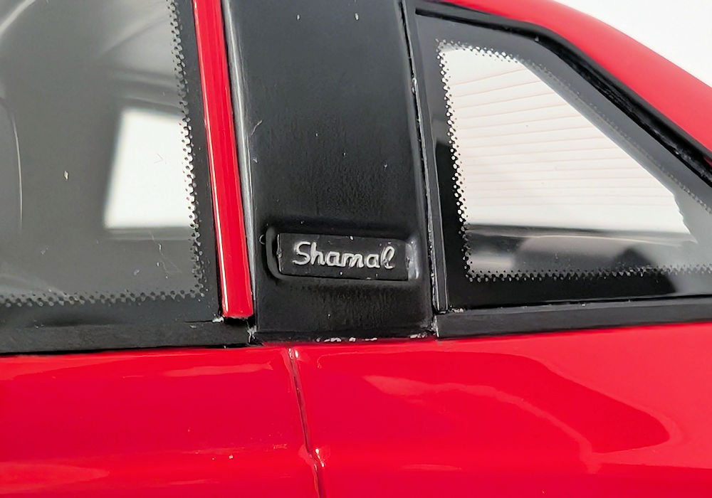 From the side, the rear wheel arch should be sharper – it is too rounded on the model. I do appreciate the black logo on the fuel door and the inclusion of a silver key lock on the door handle. The Shamal script on the side pillar is present too. The side turning signal is a separate piece of orange plastic – I can definitely appreciate that.