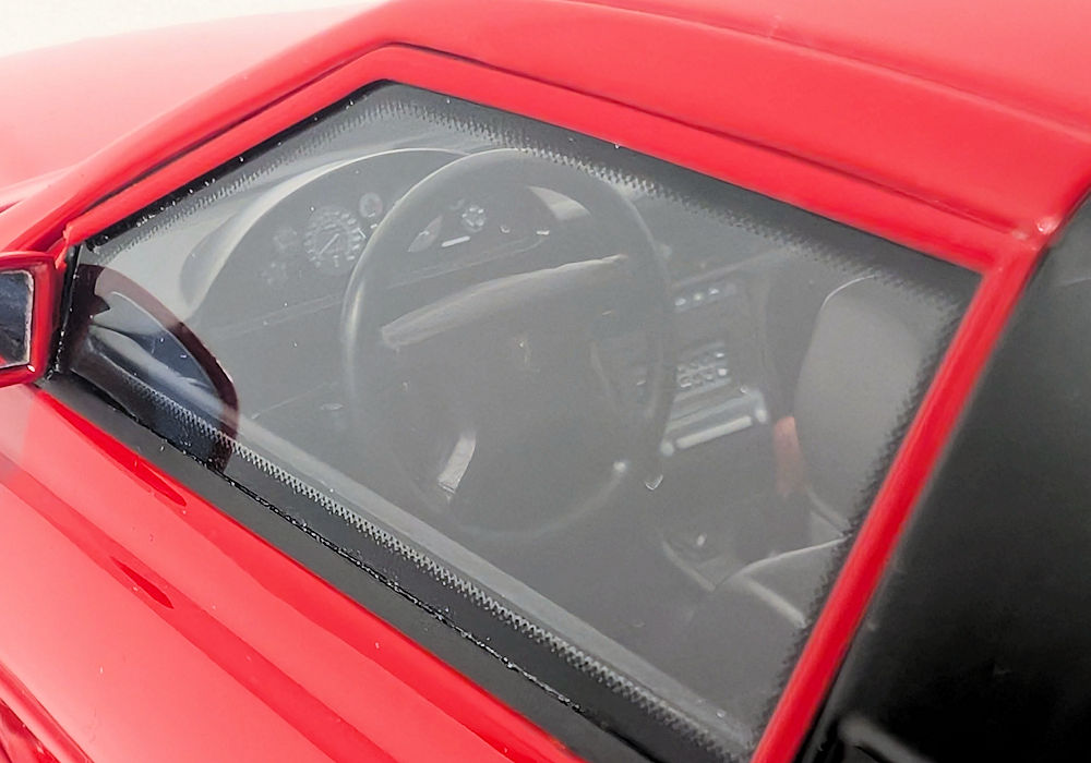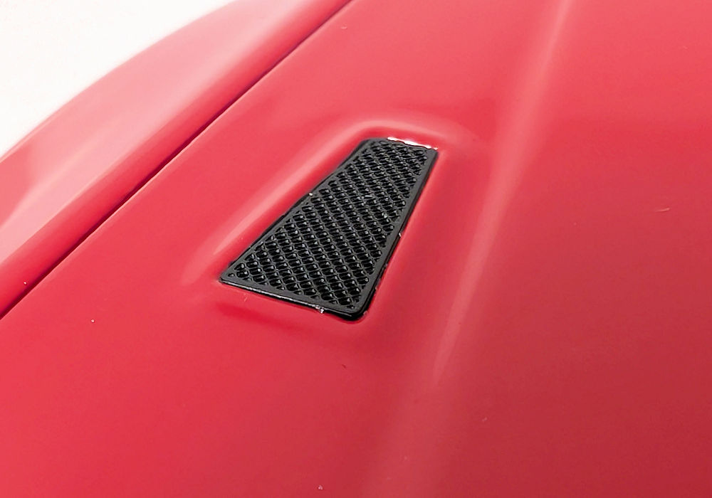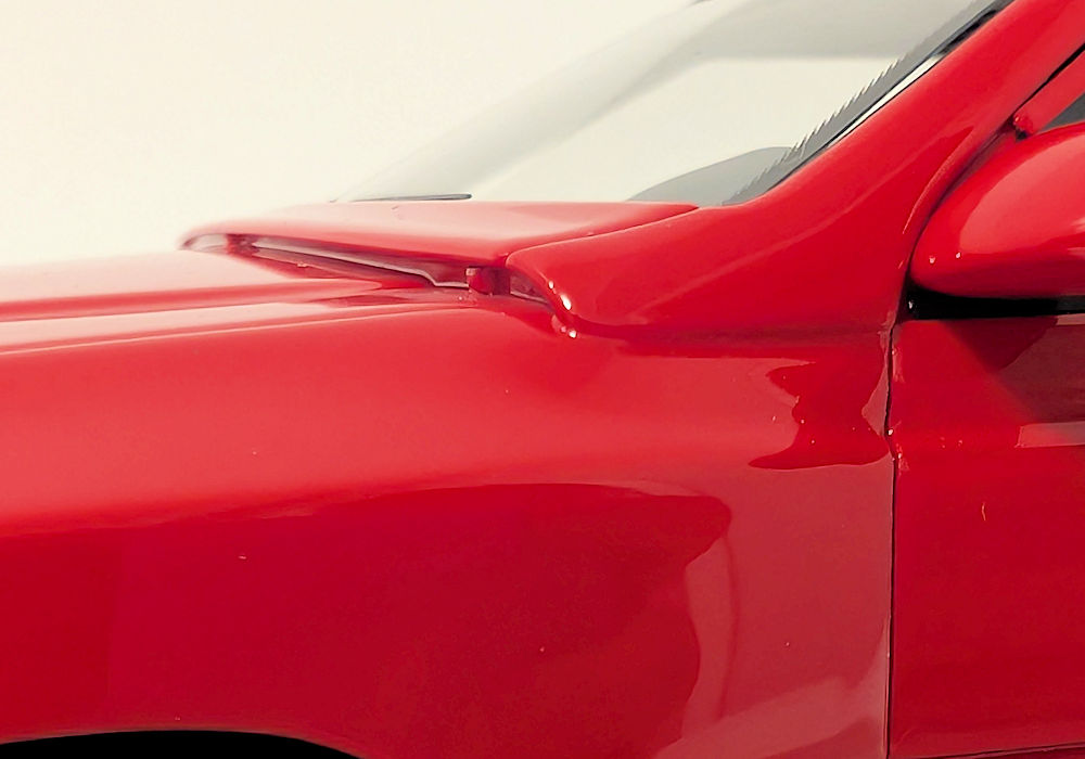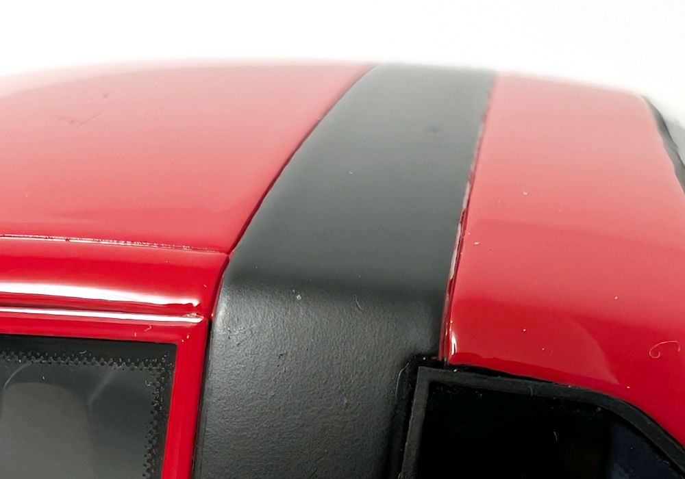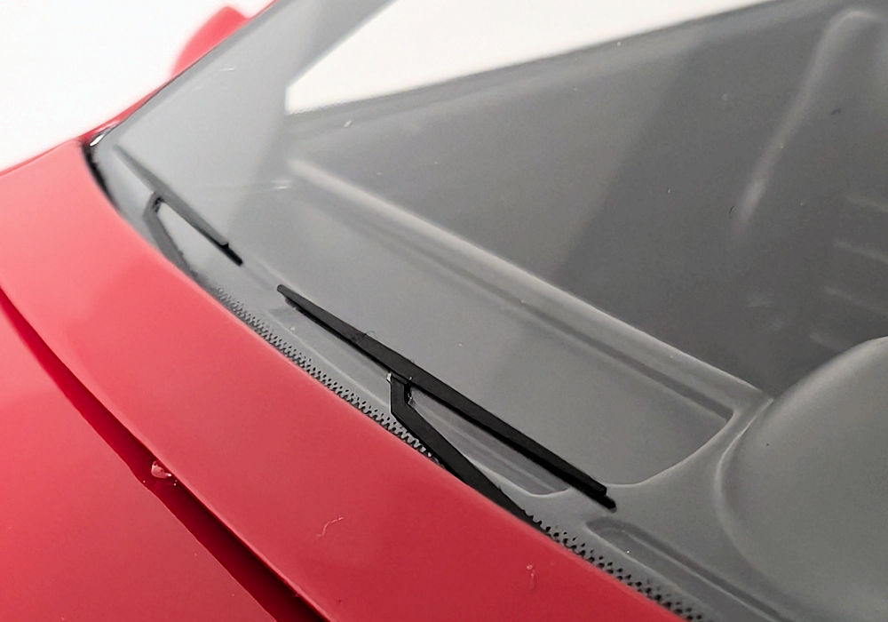 Out of the box, I can definitely see some shortcomings – this is unfortunate, as this model costs more than better quality models from brands such as GT Spirit. Paint execution of red is mostly smooth, however black painted bits could use some refinement. Trim areas around the side windows are poorly done – they are not properly adhered to both sides and are left hanging. And the window wipers- I am sorry, but they are very inaccurate. The raised aero element that looks like a spoiler running across the width of the front hood (just before the wipers) should be open, but instead it’s just a sealed piece – again not accurate.