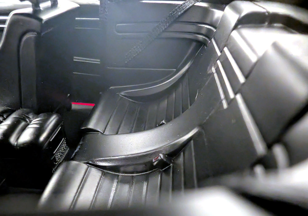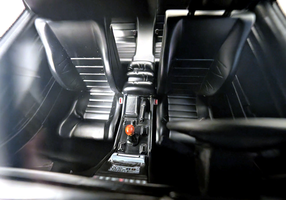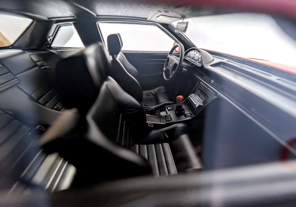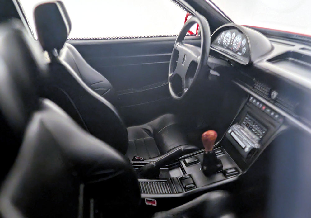 Inside, the model is satisfactory with cloth seat belts and a wooden-looking gear shift knob. Buttons have pictures on them, and the gauge cluster is replicated in the form of a decal.