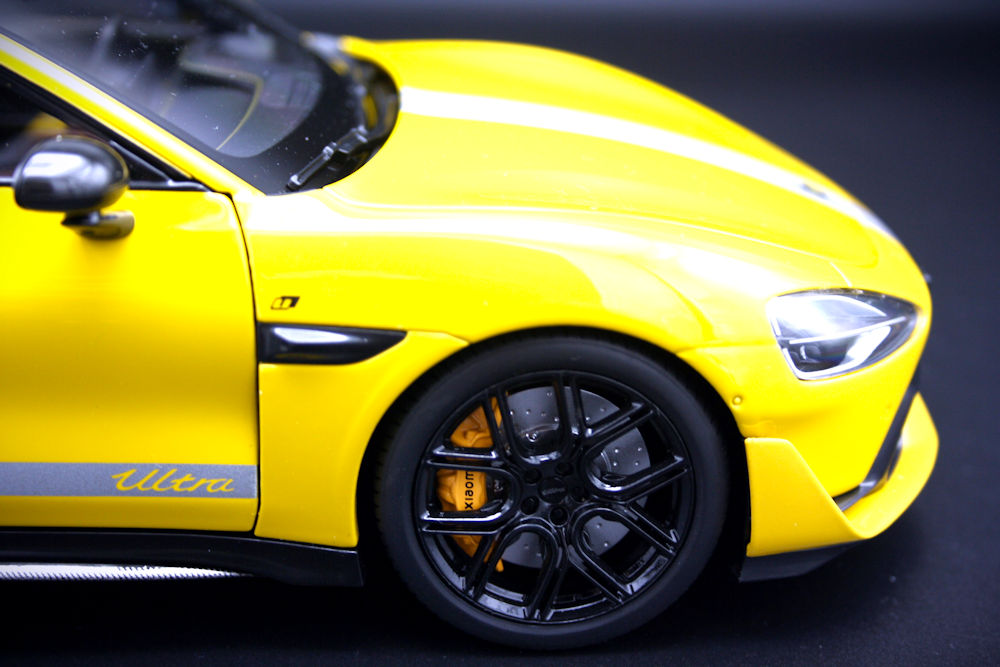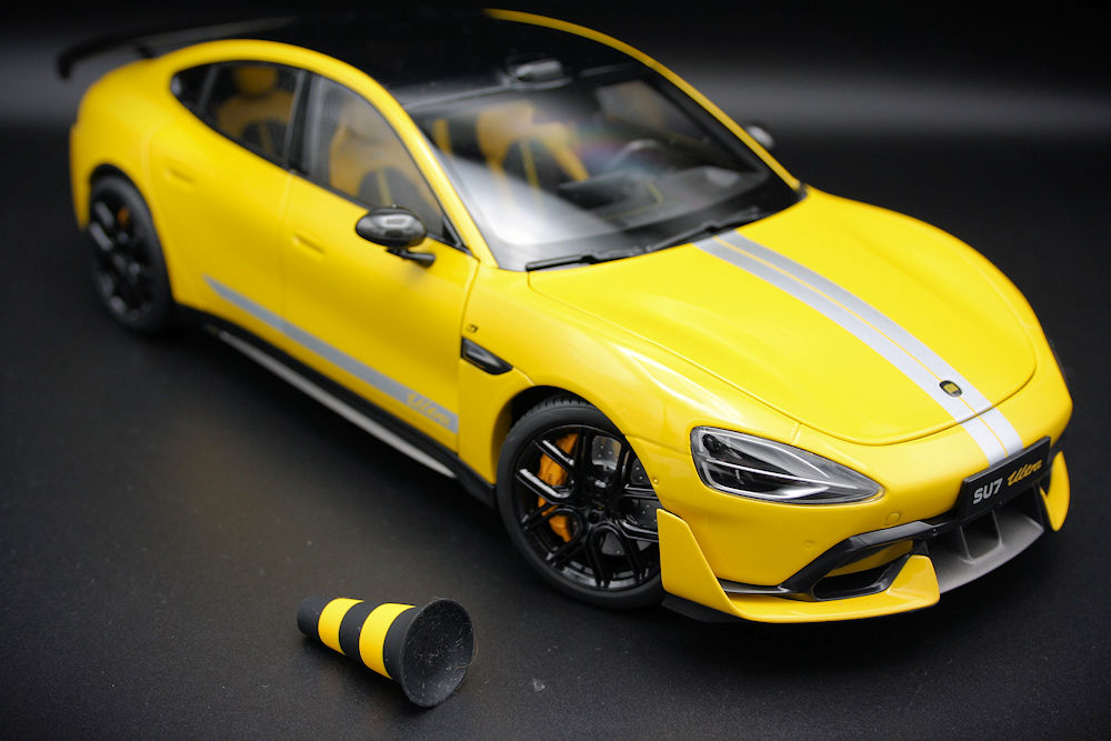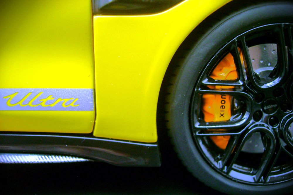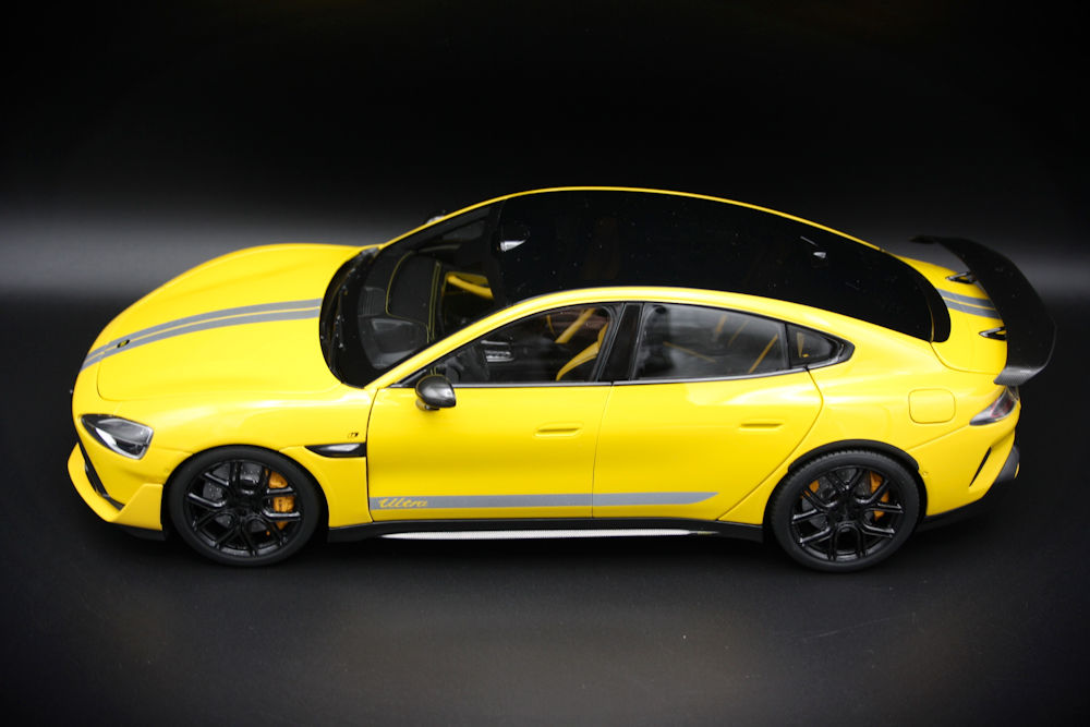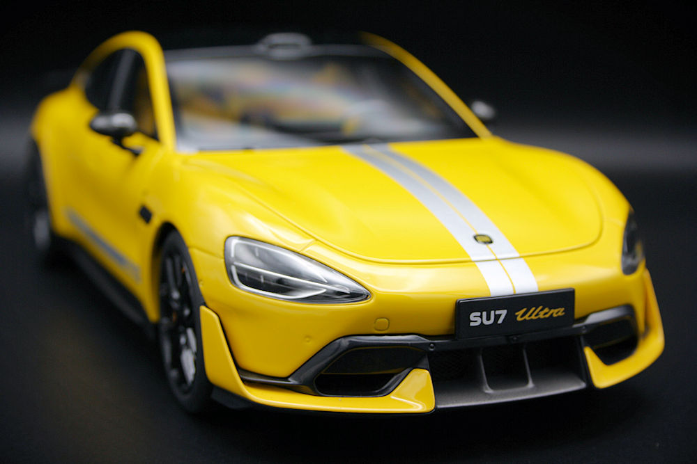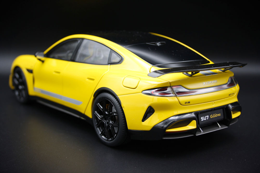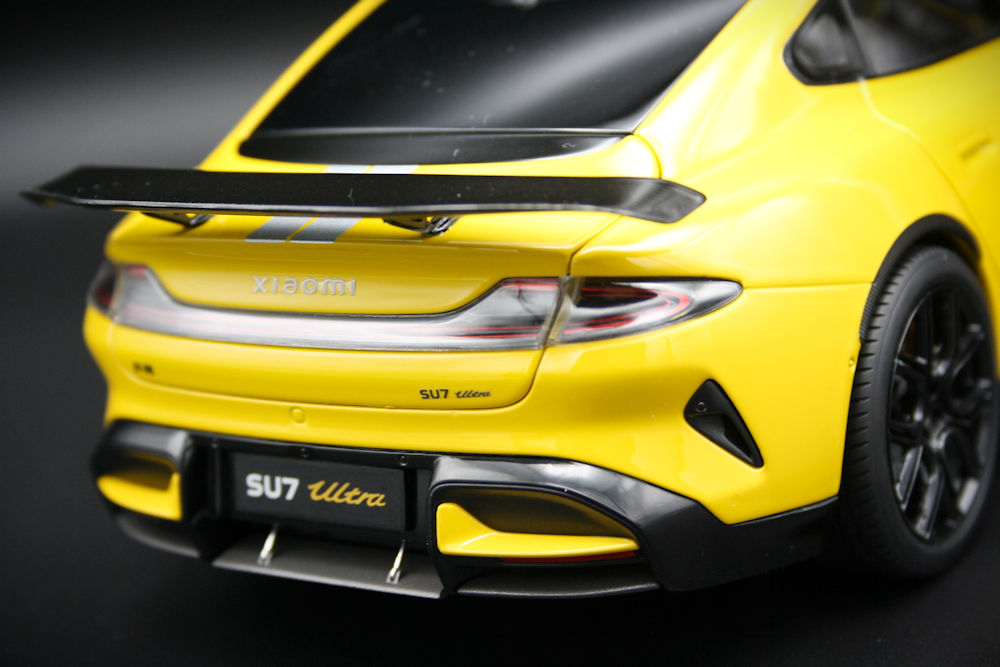 The model nicely captures the Taycan-esque shape, and the Ultra version has nice details to add to the normal SU7, like the silver racing stripes, carbon accents, carbon door mirrors, front spoiler with side-fins, the carbon fixed rear wing and the rear diffuser in its open position. Like the separate-piece charging port flap, none of these are functional, and the box warns you not to try. The Porsche-font “Ultra” script is not only found on the Chinese format license plates and embedded in the racing stripes along the car´s flanks in Porsche-style, but can be found on the carbon lip along the rocker panel and the center of the 21” wheels.