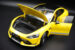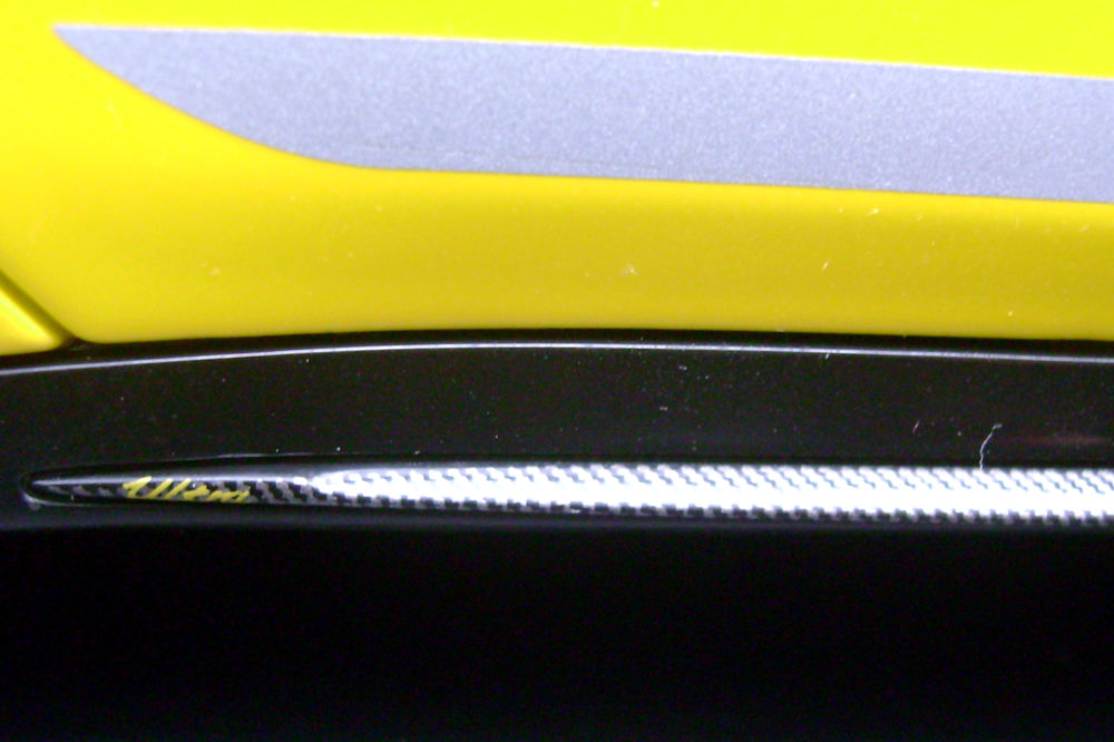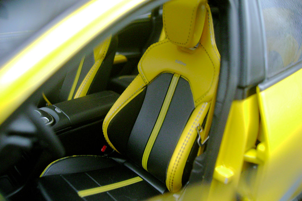 What it will help you do, though, is open the really tight four doors of the cabin and like on a real car with frameless windows, be advised to ever grab them by the windows as they might break. My first model arrived with such an issue in the box and had to be replaced. With due care, it´s absolutely worth accessing the cabin, greeted by a scripted threshold plate. You will hardly notice the missing carpet with the fireworks of other interior details offered. Again, more attractive than the SU7 base model, your eyes can feast on a two-tone yellow and black interior, including yellow stitching, yellow fabric seat belts and carbon applications. Notice the silver dots on each side of the dashboard near the doors? These replicate the mounting sockets the original car has to mount GoPro cameras to record the thing being thrashed around a track.