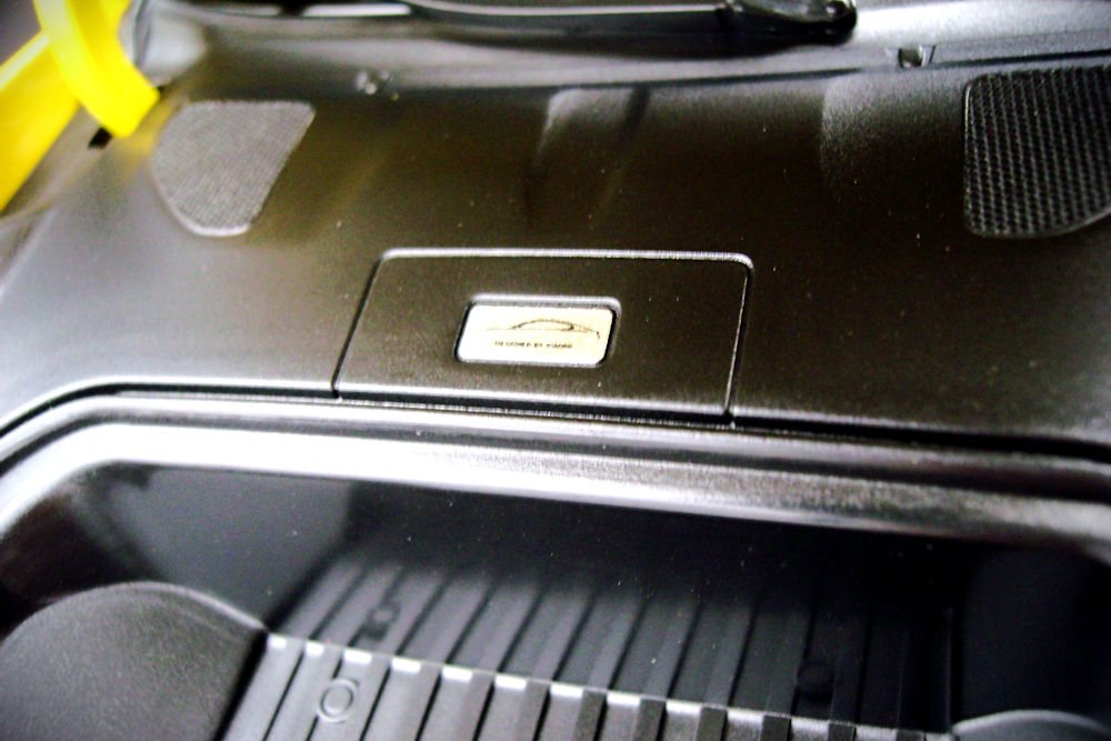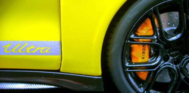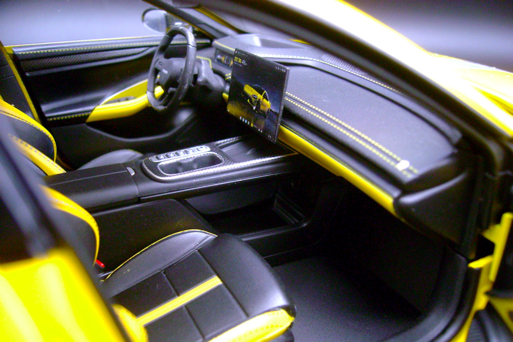 In the front, McLaren-style headlights offer nicely detailed projectors behind the lenses. The model has received the 24k-gold-plated badge as an elevated piece on the hood, and the lower grille is perforated, not just a structured plastic plate. The frunk does open, and although the struts that do it electrically on the original car are missing, the dog-legged hinge is true to the original. The inside of the frunk is only spectacular in having the plaque that proudly states the car´s performance figures underneath its silhouette.