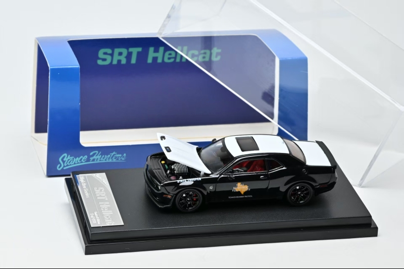 Stance Hunters drops this uber cool 1:64 Dodge Challenger Hellcat SRT Hellcat Texas State Trooper Livery replica. This metal and semi-opening shows a little detail under the bonnet. Delivery is noted as April 2026.