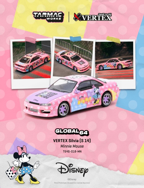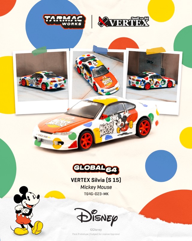 Tarmac will issue two VERTEX Silvia (S15) replicas inspired by Mickey and Minnie Mouse.  These metal and sealed models will arrive in January 2026.  Do the youth of today know these Disney characters?