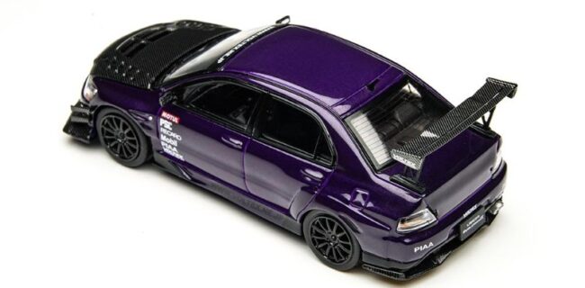 News from the Time Micro camp is the 1:64 scale metal and sealed Mitsubishi Evo 9 Lancer Evolution IX. This example is presented in Metallic Purple exterior. Delivery is noted as May 2026.