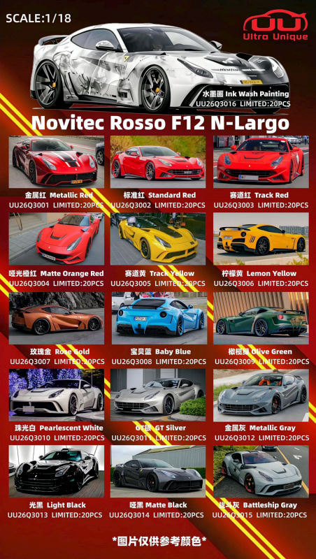 Uitra Unique will execute the 1:18 resin and sealed Novitec Rosso F12 N-Largo. Plenty of exterior colours to choose from, 16 to be exact. Options include: Metallic Red, Standard Red, Racing Red, Matte Orange Red, Racing Yellow, Lemon Yellow, Rose Gold, Baby Blue, Olive Green, Pearl White, GT Silver, Metallic Grey, Gloss Black, Matte Black, Battle Grey and Ink Wash Painting. Each is capped at 20 pieces. Suggested retail $475 CND with Q3 2026 delivery.